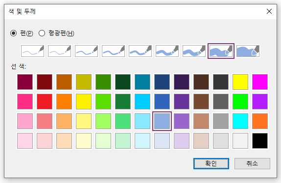 펜 옵션의 바로 오른쪽에는 색 및 두께 버튼이 있는데, 위에서 고를 수 있는 옵션보다 더 많은 색상과 두께를 제공하고 있어요.
