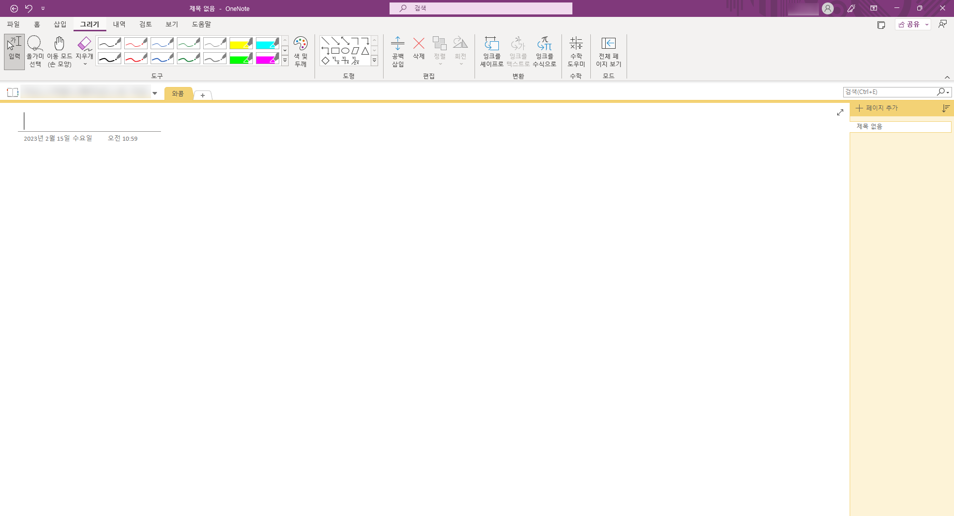원노트를 열면 이렇게 아무것도 없는 빈 화면이 나옵니다. 이 빈 공간을 원하는 대로 채울 수 있어요. 이번 시간에는 와콤 타블렛과 디지털 펜으로 원노트를 사용할 것이기 때문에, 먼저 상단 메뉴에서 그리기 메뉴를 선택해줍니다.
