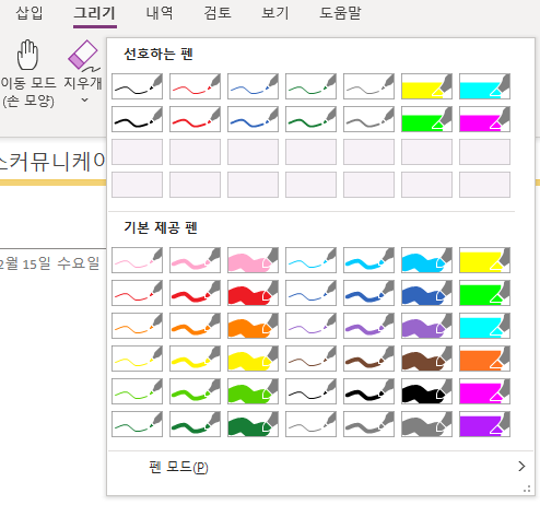 그리기 메뉴에 들어가니 도구 탭에 들어있는 펜 목록이 가장 먼저 눈에 들어옵다. 기본 메뉴 상태에서는 12개의 옵션만 확인할 수 있는데요, 자세히 보기 버튼을 누르면 이미 확인한 12개 옵션은 물론이고 다른 기본 제공 펜을 확인할 수 있어요. 색상도 두께도 조금 더 다양해졌지요?