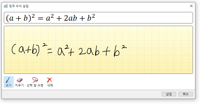 그리기 메뉴의 오른쪽에 있는 변환 탭에서 잉크를 수식으로 만드는 기능을 사용해볼게요. '잉크를 수식으로' 버튼을 누른 뒤 노란색 칸 안에 원하는 수식을 써주세요. 그러면 자동으로 인식되면서 그 위에 수식이 생기는데요, 원하는 대로 인식이 됐으면 삽입 버튼을 눌러 화면 위에 수식을 올려놓을 수 있답니다.