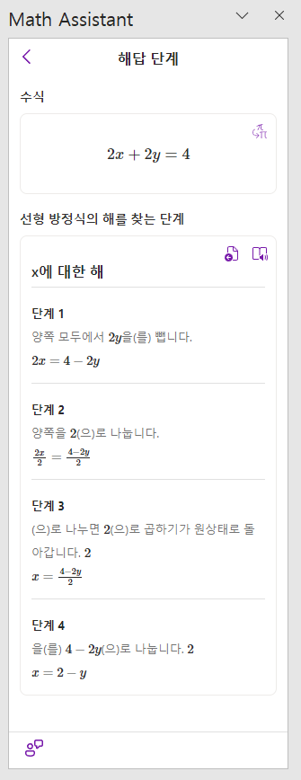 알아서 수식을 인식하고, 심지어 어떤 방정식인지, 해를 찾으려면 어떻게 해야 하는지 정말 자세하게 잘 알려주세요. 수학 공부를 하다가 모르는 부분이 있는 학생들이 유용하게 사용할 수 있는 기능입니다. 여러모로 수학 수업에서 시간을 줄여주는 효자 프로그램이에요.