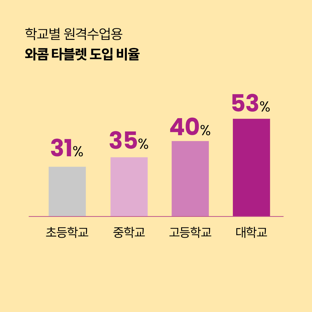 학교별 원격수업용 와콤 타블렛 도입 비율을 계산했을 때는, 초등학교의 31%, 중학교의 35%, 고등학교의 40%, 대학교의 53%가 와콤 타블렛을 도입했습니다. 교육 현장에서의 와콤 타블렛 도입은 앞으로도 꾸준히 증가할 것으로 예상됩니다.