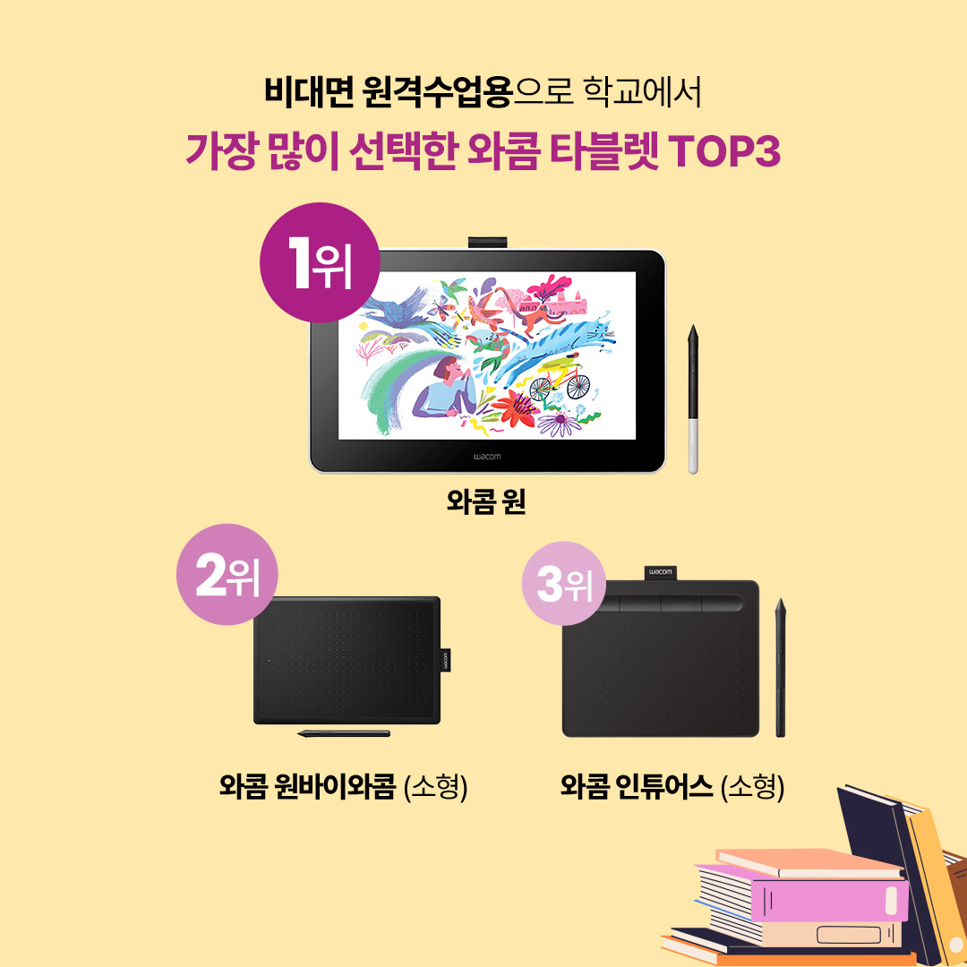 초, 중, 고등학교는 물론이고 대학교까지 모든 학교에서 사랑받는 와콤 타블렛. 비대면 원격수업용으로 가장 많이 선택받은 제품은 액정타블렛 와콤 원입니다. 그 뒤를 이어 펜타블렛 와콤 원바이와콤 소형과 와콤 인튜어스 소형 모델까지 TOP3에 자리했어요.