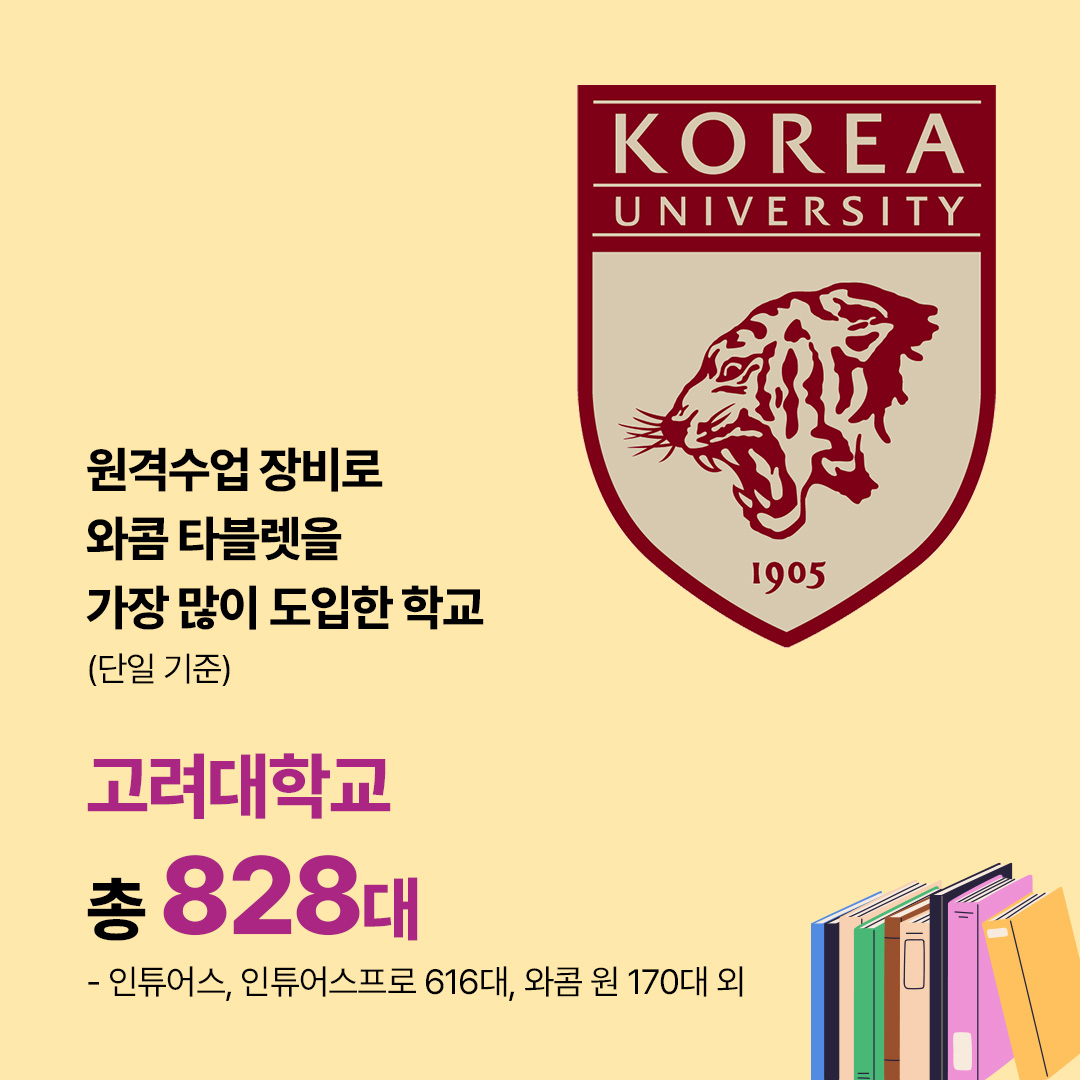 그렇다면 전국 모든 학교 중에서 원격수업 장비로 와콤 타블렛을 가장 많이 도입한 학교는 어디일까요? 단일 기준으로 계산했을 때, 고려대학교가 총 828대로 가장 많은 와콤 타블렛을 도입했습니다. 펜타블렛 인튜어스, 인튜어스프로 616대와 액정타블렛 와콤 원 170대를 비롯해 와콤 타블렛을 도입했어요.