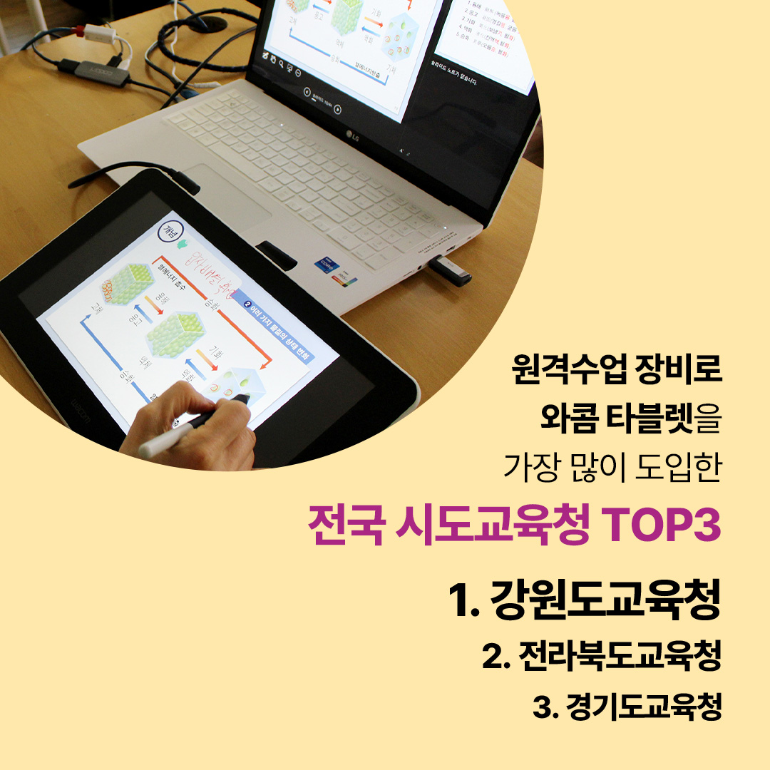 전국에서 인기를 얻는 와콤 타블렛인 만큼, 다양한 시도교육청에서 기기 지원 사업을 하면서 와콤 타블렛 도입을 지원하고 있다고 하죠. 그 중에서도 와콤 타블렛을 원격수업 장비로 가장 많이 도입한 교육청은 강원도교육청입니다.