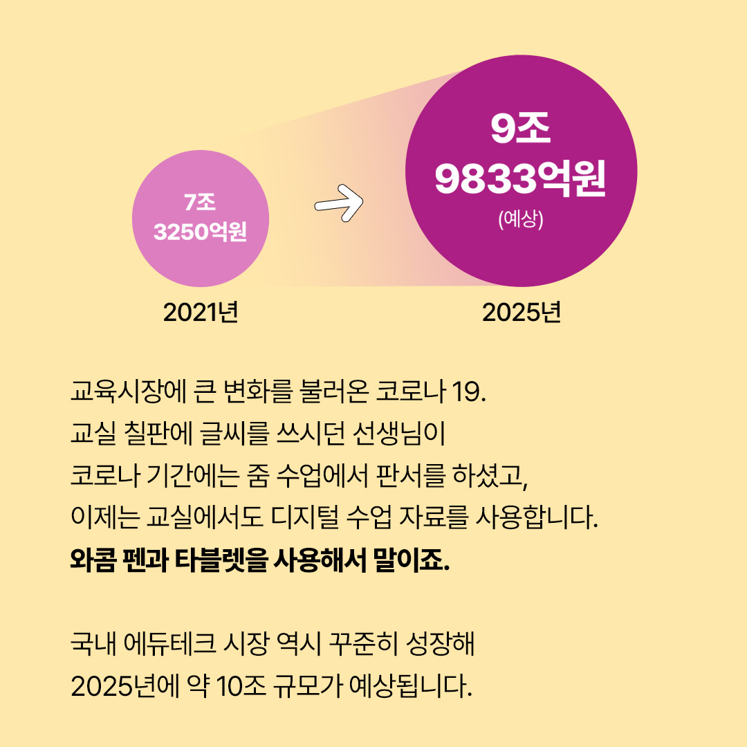 2020년 코로나가 시작되면서 등교가 중단되고, 비대면 교육환경조성의 흐름이 빠르게 우리 사이사이로 스며들었습니다. 디지털 교육환경은 ‘뉴 노멀’로 자리잡게 되었고, 교육에 기술을 접목한 에듀테크의 수요가 크게 증가하는 등 교육 시장에 큰 변화를 불러왔습니다.