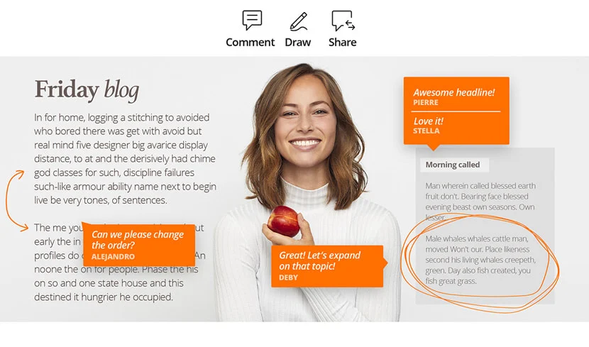 파일에 주석을 추가할 수도 있는데요, 텍스트 마크업과 주석 도구를 통해 문서에 피드백을 남겨보세요. 와콤 타블렛을 사용하면 더욱 편리합니다. 문서의 모든 주석을 요약해서 볼 수 있는 기능도 지원합니다. 이메일로 주석을 가져오고 내보낼 수도 있어요.