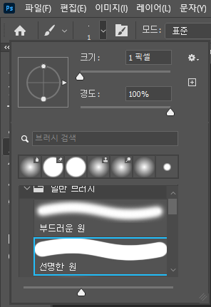 트레이싱을 할 때는 일반적으로 브러시를 사용하는데, 와콤 블로그지기는 선명한 원 브러쉬를 사용했습니다. 크기는 1-3픽셀 정도가 적당해요. 만약 선을 그었는데 생각보다 선명하지 않은 것 같다면, 이미지 크기가 100% 상태인지 확인해 주세요. 큰 이미지를 축소해서 작업하는 경우 선이 연하게 보일 수 있습니다.