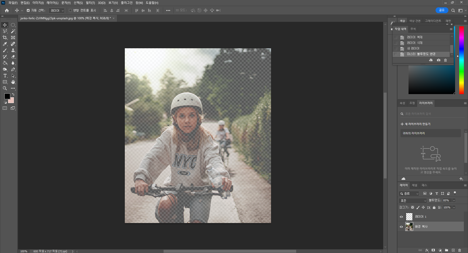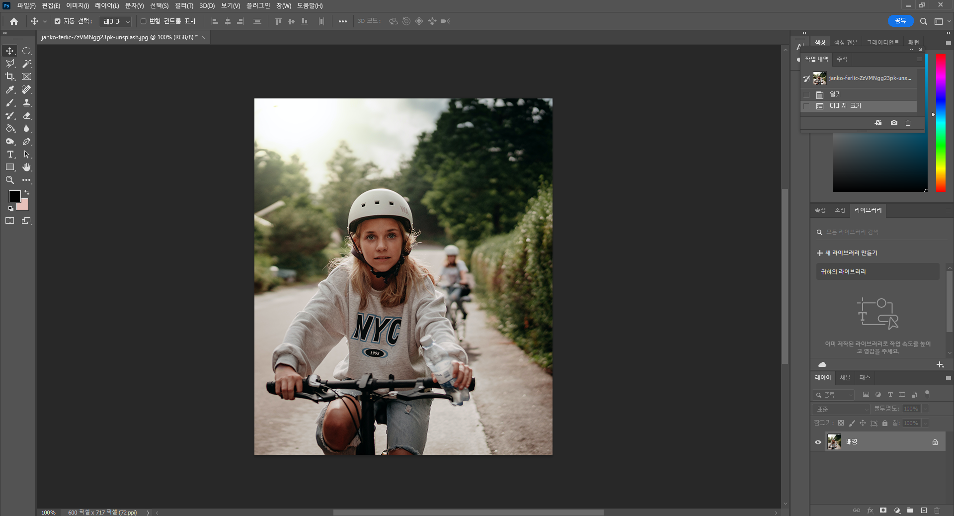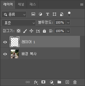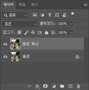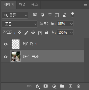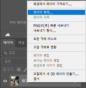 이미지를 막 열면 레이어창에 배경 레이어 하나만 있을 텐데요, 마우스 우측 버튼 또는 Ctrl+J를 눌러서 해당 레이어를 복제해 줍니다. 그리고 복사된 레이어가 생기면 원래 있던 배경 레이어를 삭제해 주세요.