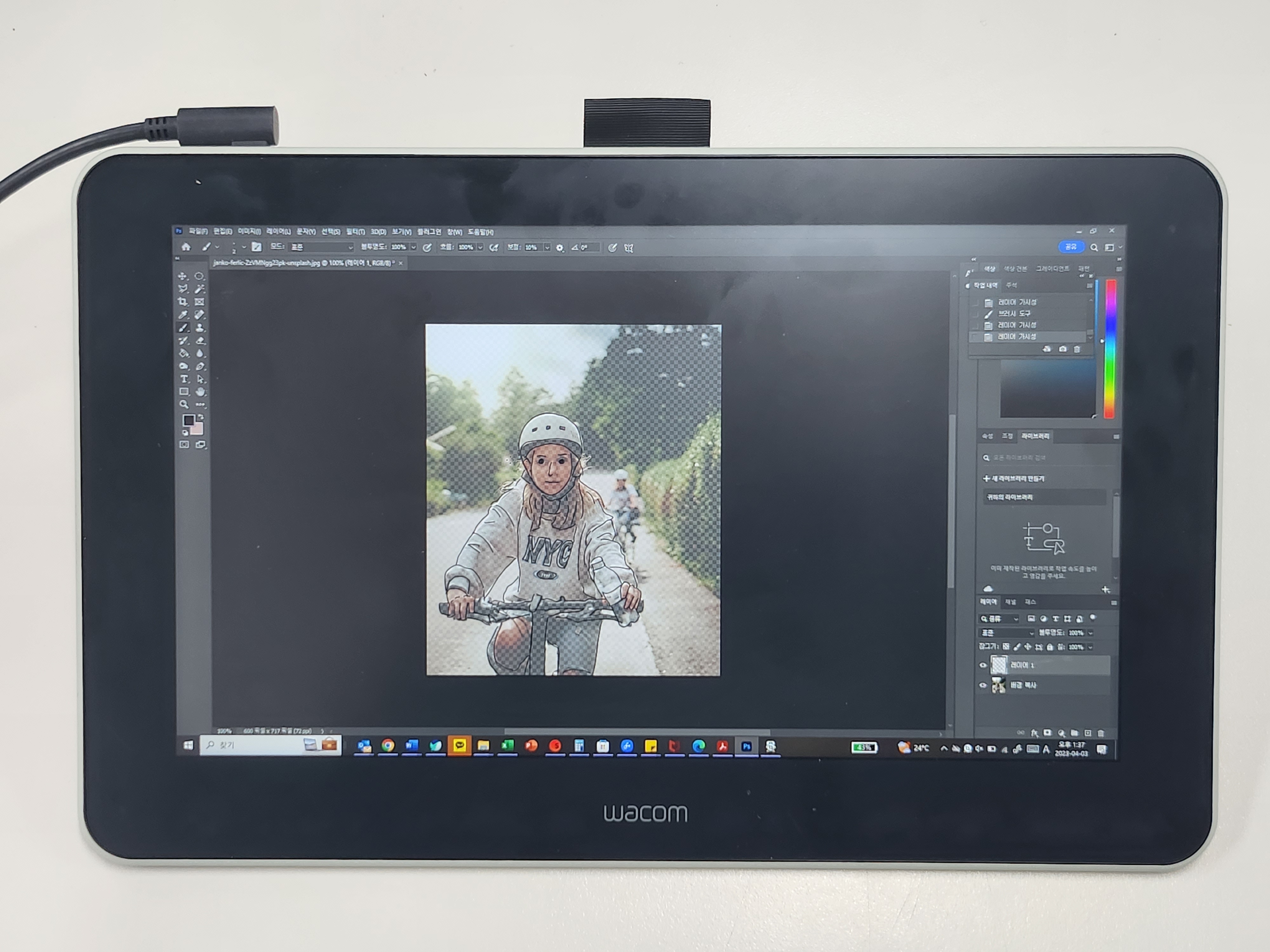 준비물은 포토샵과 트레이싱할 이미지, 그리고 가장 중요한 타블렛! 트레이싱은 펜타블렛, 액정타블렛 상관없이 가능하지만, 블로그지기는 액정 위에 직접 작업하는 것이 좋아서 액정타블렛 와콤 원을 준비했어요. 트레이싱은 원본 위에 작업이기 때문에, 저작권 문제가 발생하지 않도록 무료 이미지 사이트인 언스플래시에서 다운로드했습니다.