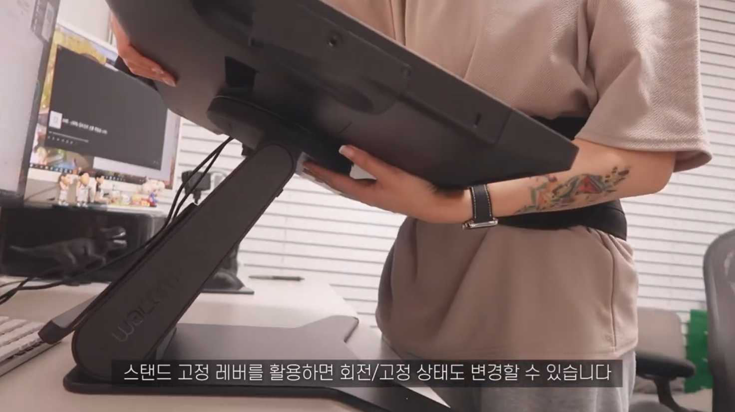 신티크 프로 27은 스탠드가 내장되어 있지 않으며, 별도의 전용 스탠드를 구매해서 사용할 수 있는 제품입니다. 신티크 프로 27을 든든하게 받쳐주는 스탠드는 각도 조절이 가능해서, 상하좌우로 선호하는 자세에 맞게 움직일 수 있어요. 하단의 스탠드 고정 레버를 활용해 편리하게 회전과 고정 상태를 변경할 수 있습니다.