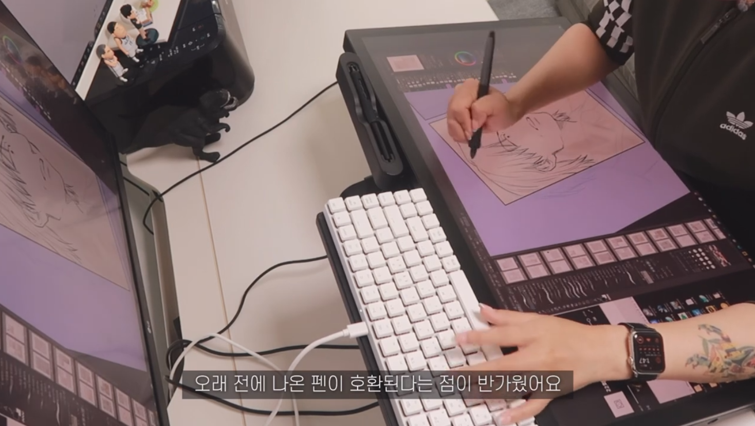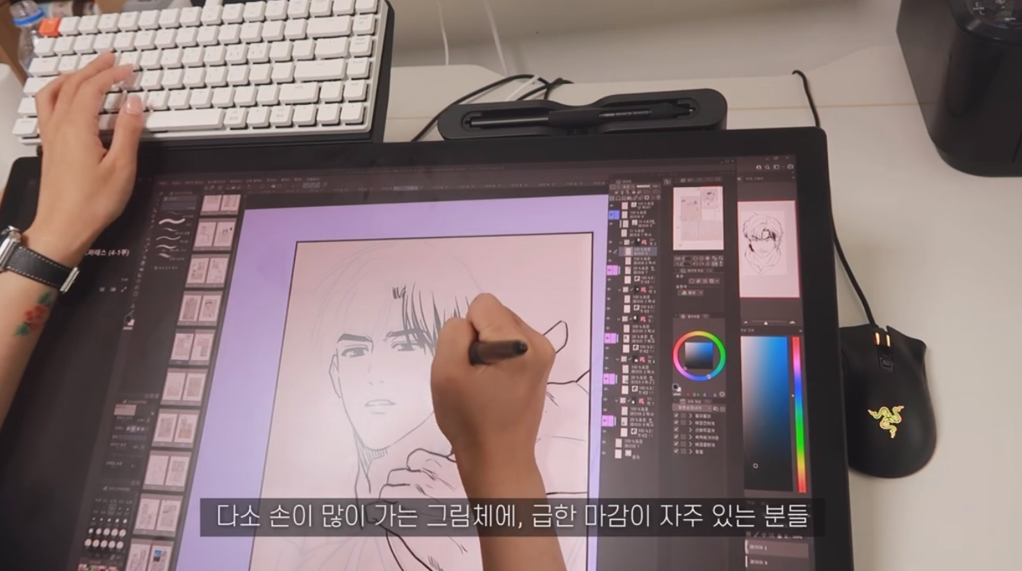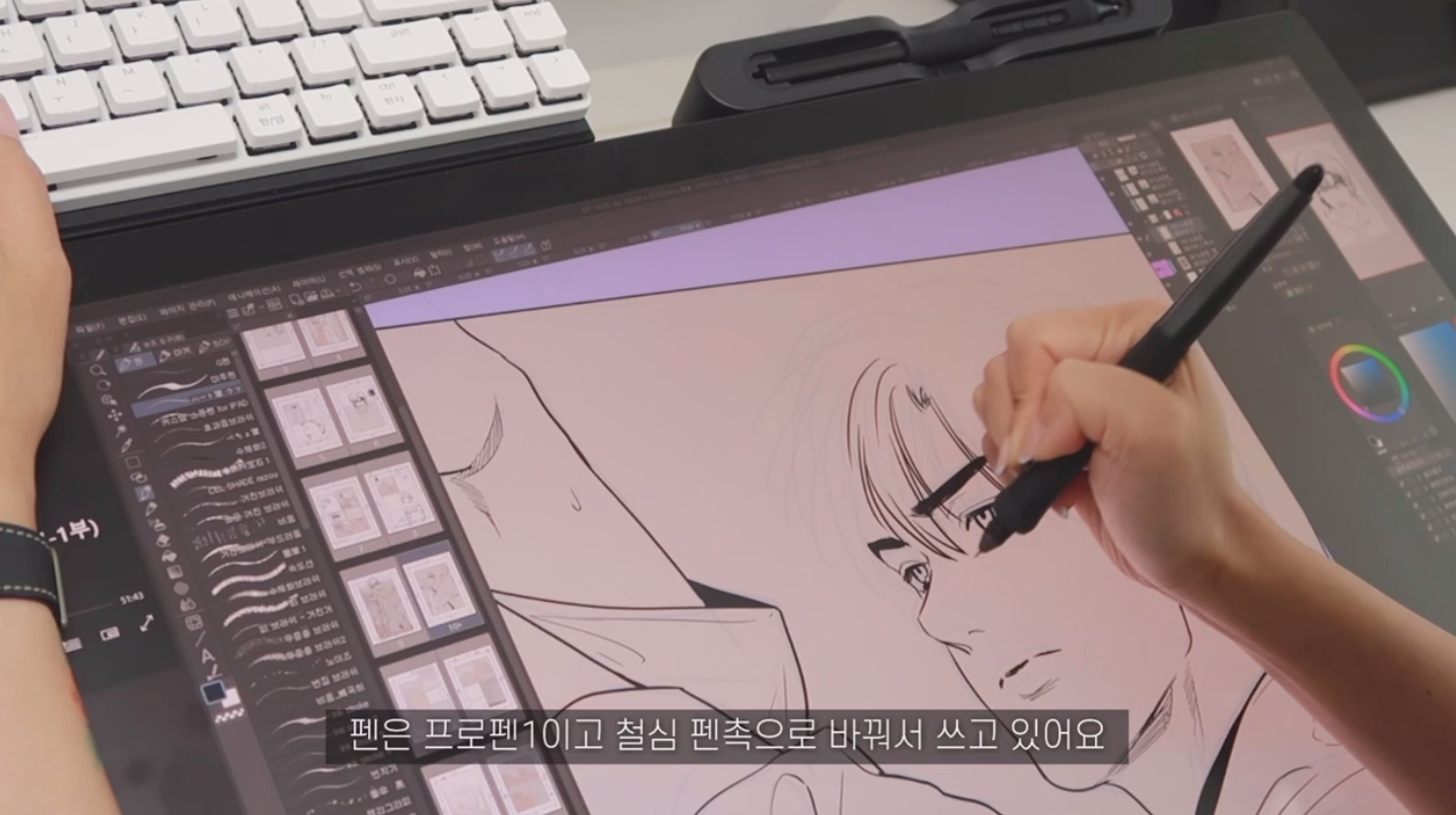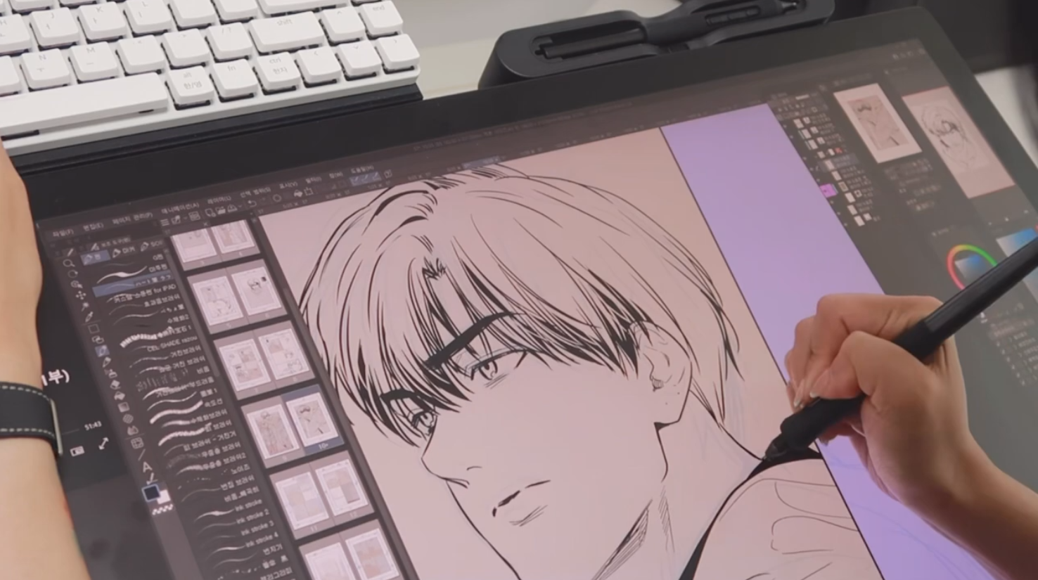 또 다른 날 작업하는 모습. 이번에는 익스텐션 테이블에 키보드를 올려둔 상태에서 작업을 진행했는데요, 펜은 프로 펜 3가 아닌 킹뿌꾸님이 기존에 사용하는 와콤 프로 펜 1을 사용했습니다. 와콤 프로 펜 3는 신티크 프로 27에서만 사용 가능하지만, 이전에 나온 프로 펜 1,2를 신티크 프로 27에서 사용하는 것은 문제 없어요. 킹뿌꾸님은 오래 전 나온 펜이 호환되어서 반가웠다고 합니다. 작가님의 손에서 점점 형태를 갖춰가는 잘생긴 인물이 눈에 띄네요.