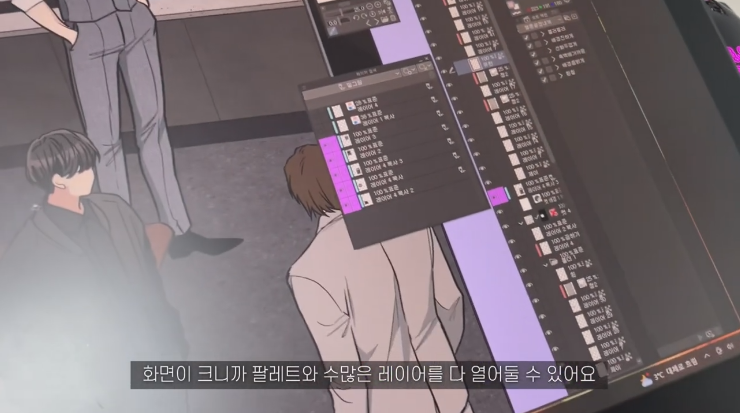 넓은 디스플레이의 장점은 역시 작업 중 필요한 다양한 창을 띄울 수 있다는 것입니다. 여러 프로그램을 한 화면에 띄우는 것도 가능하고, 킹뿌꾸님처럼 그림을 그리는 프로그램 내에서 다양한 팔레트와 레이어를 전부 열어둘 수 있어서 하나하나 찾지 않아도 됩니다.