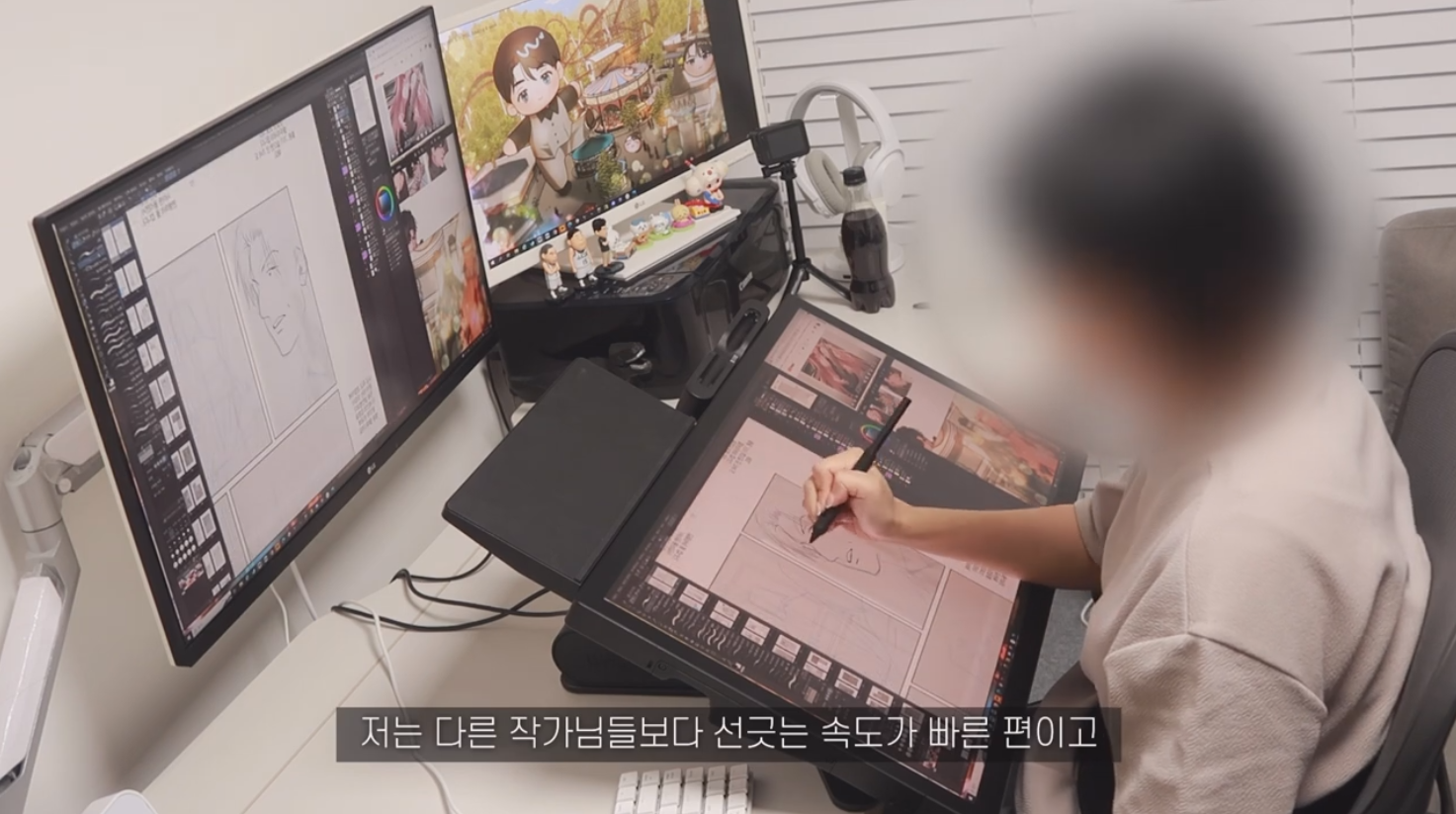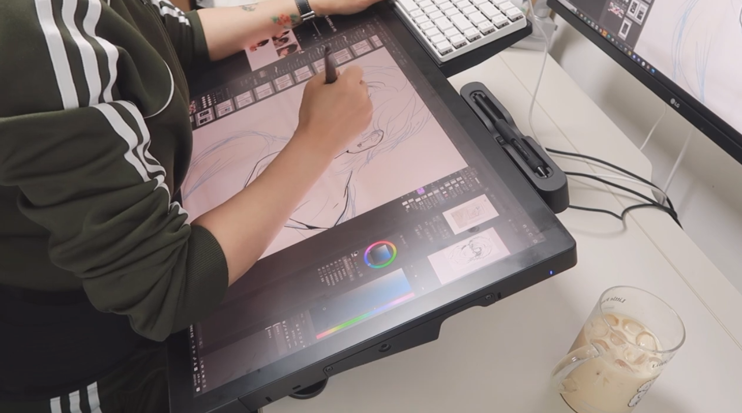 킹뿌꾸님이 체감한 신티크 프로 27의 가장 큰 변화는 바로 높아진 주사율입니다. 신티크 프로 27은 120Hz 주사율을 지원함으로써 현존하는 액정타블렛 중에서 가장 고스펙을 자랑합니다. 킹뿌꾸님은 다른 웹툰 작가들에 비해 선긋는 속도가 빠른데다가 화면이 속도를 따라오지 못하면 답답한 성격인데, 신티크 프로 27을 사용하면서 확실히 선이 부드러우면서도 빨리 표현되었다고 해요. 특히 주사율은 역체감이 크게 되는 부분이기도 합니다.