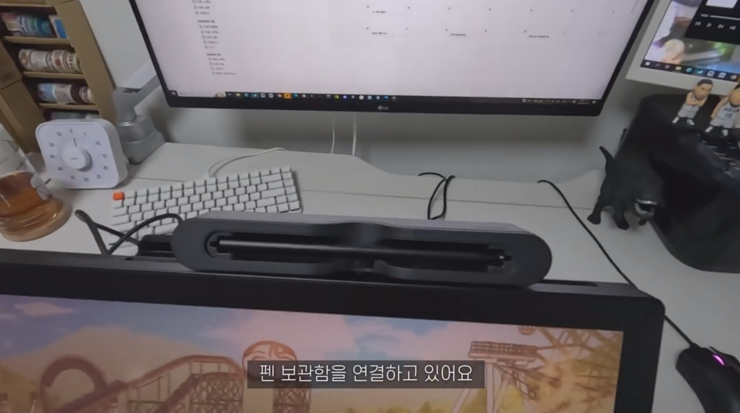 액정타블렛은 사용자마다 사용 방식이 다르기 때문에 본인에게 잘 맞는 높이와 각도 등을 찾는 게 중요합니다. 킹뿌꾸님이 선호하는 스타일은 캔버스를 좌측에 두고, 키보드도 왼쪽 아래 내려놓는 것이에요.