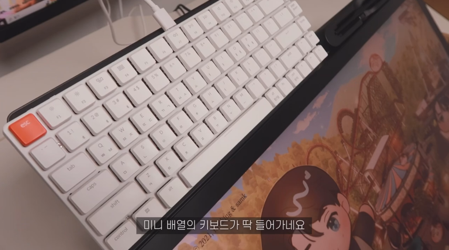 별도 판매 액세서리인 익스텐션 테이블을 사용하면 위 사진처럼 키보드 등의 액세서리를 놓을 수 있어요. 펜 보관함과 같은 방식으로 스크류홀을 사용해 타블렛 본체와 연결합니다. 킹뿌꾸님은 미니 배열의 키보드를 놓아서 작업 동선을 줄였습니다. 키보드 외에도 휴대폰, 스케치북 등의 물품을 거치할 수 있어 편리합니다.