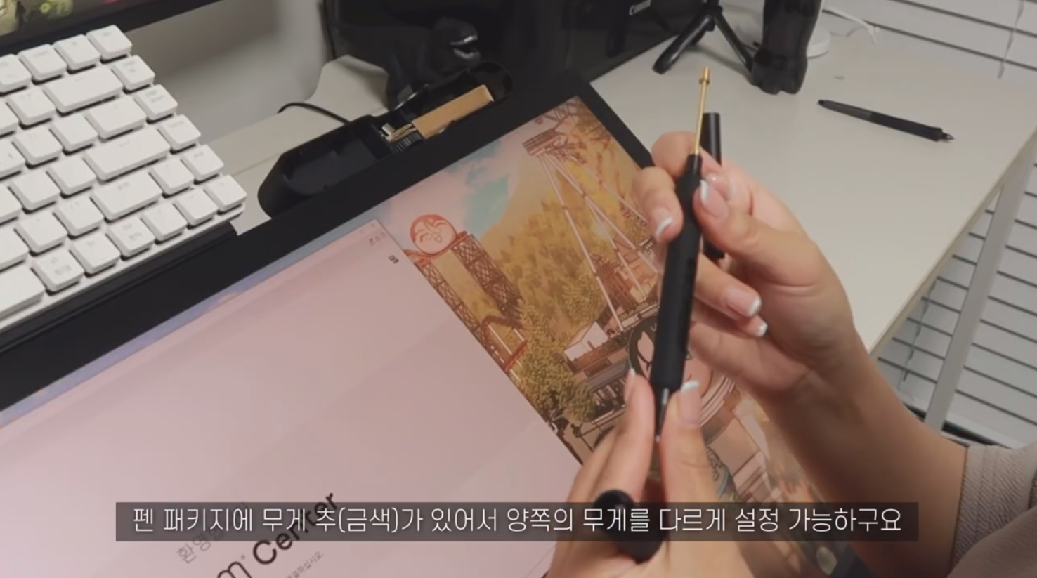 신티크 프로 27의 만족도를 극대화하는 와콤 프로 펜 3입니다. 이번 프로 펜 3는 그립과 사이드 버튼, 무게 추를 취향껏 커스터마이징할 수 있다는 장점이 있어요. 양쪽의 무게가 다른 무게 추 역시 사용자 취향에 따라 방향을 다르게 할 수 있습니다. 프로 펜 3는 와콤의 EMR 기술력이 탑재되어 당연히 무선, 무배터리, 무충전을 지원합니다. 킹뿌꾸님은 기본 펜심뿐만 아니라 펠트심을 함께 제공한다는 점이 마음에 들었다고 해요.