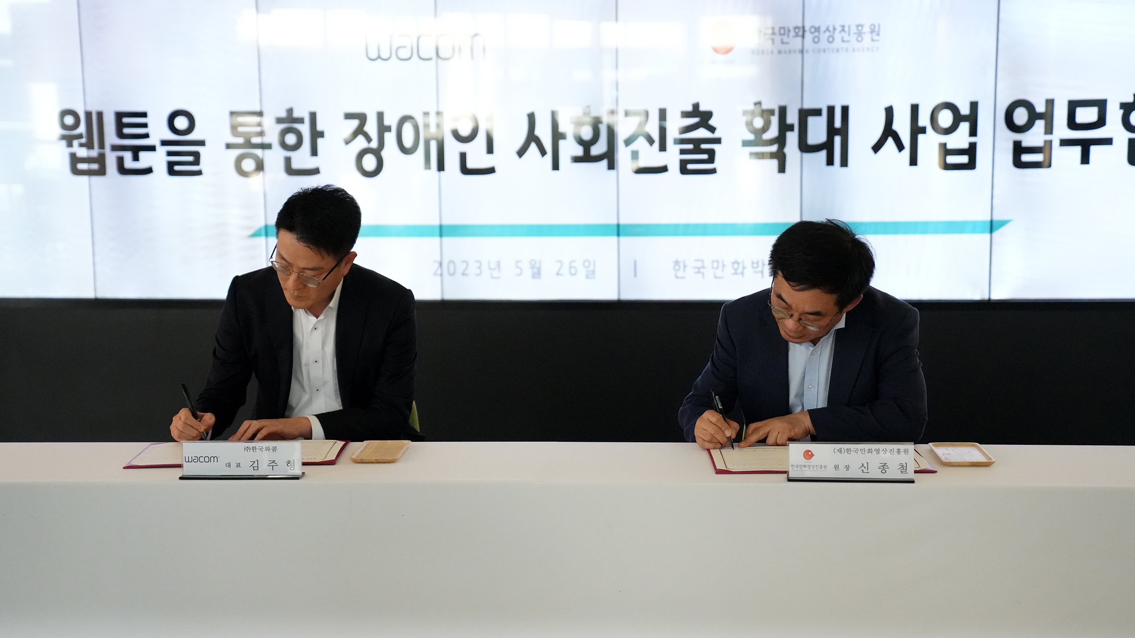 와콤이 한국만화영상진흥원과 전국 장애인 웹툰 창작 교육을 위한 사회공헌 활동을 전개합니다. 와콤과 한국만화영상진흥원은 웹툰을 통한 장애인의 사회 진출 및 자립 기반을 위한 업무협약을 체결하고, 이를 통해 전국 장애인들의 웹툰 교육을 위한 인프라 조성 및 유기적인 협력 체제를 구축할 계획입니다. 협약식은 지난 5월 26일(금) 한국와콤 김주형 대표, 한국만화영상진흥원 신종철 원장 등 관련 인사들이 참석한 가운데 한국만화박물관에서 진행됐습니다.