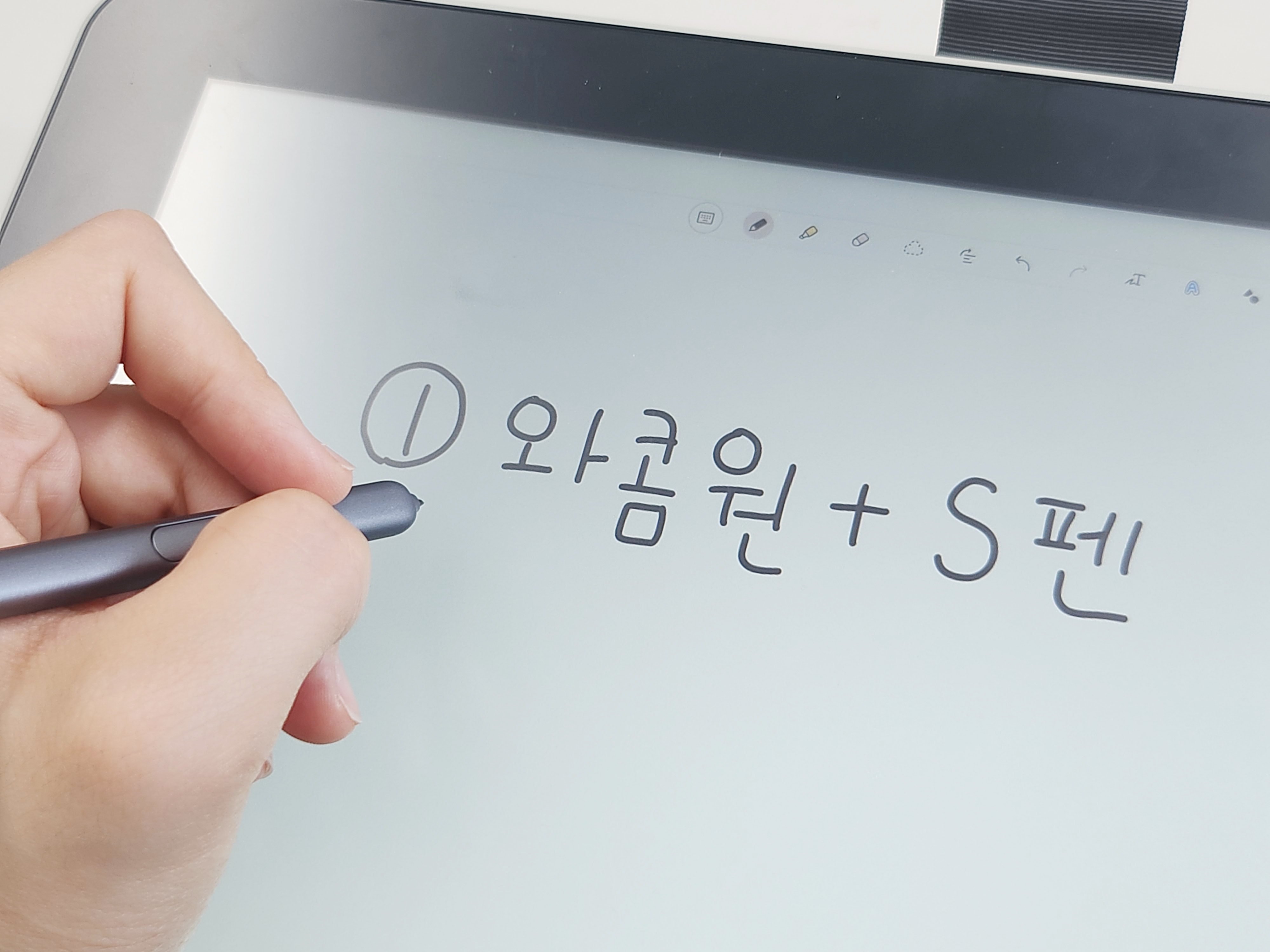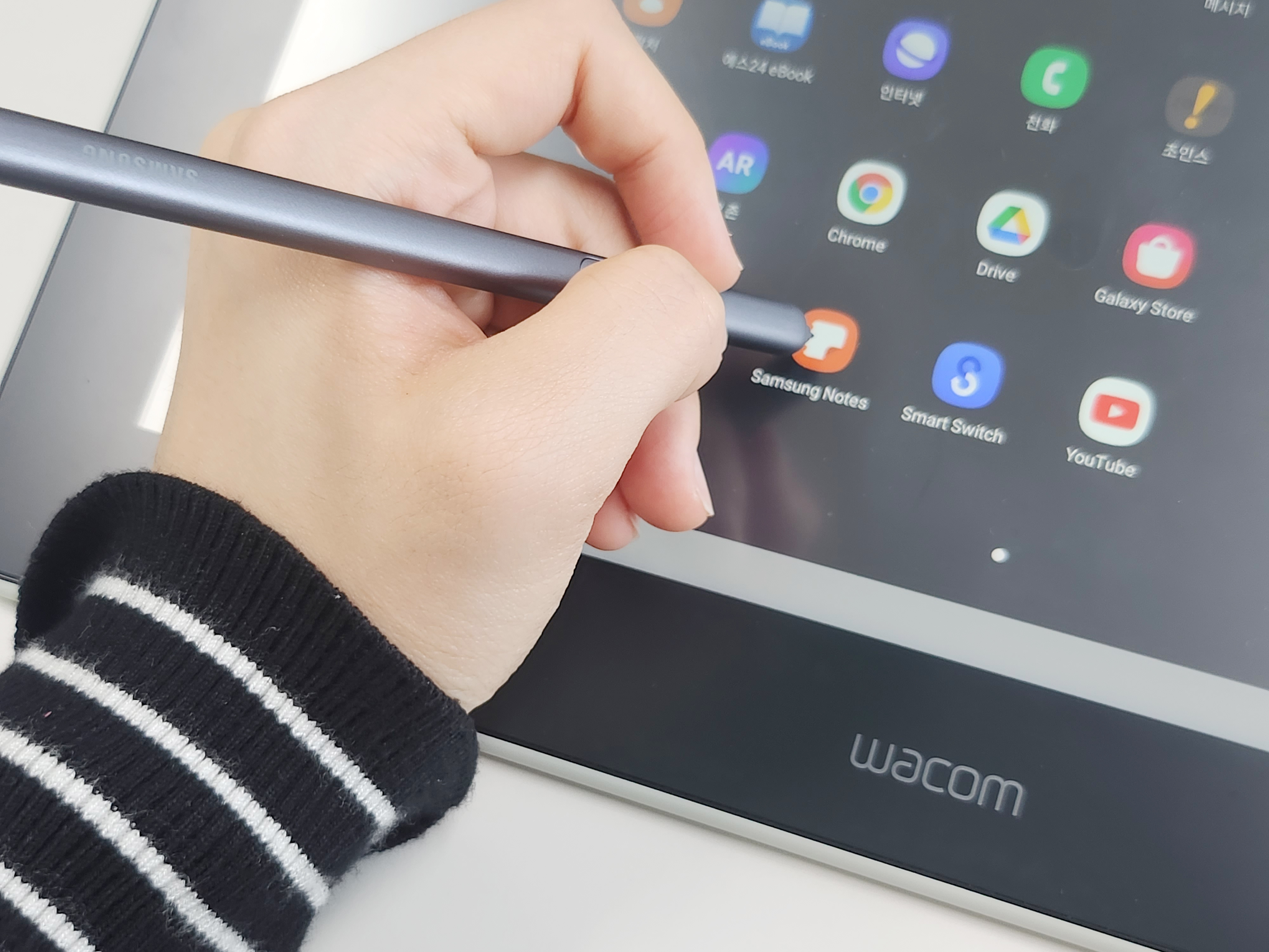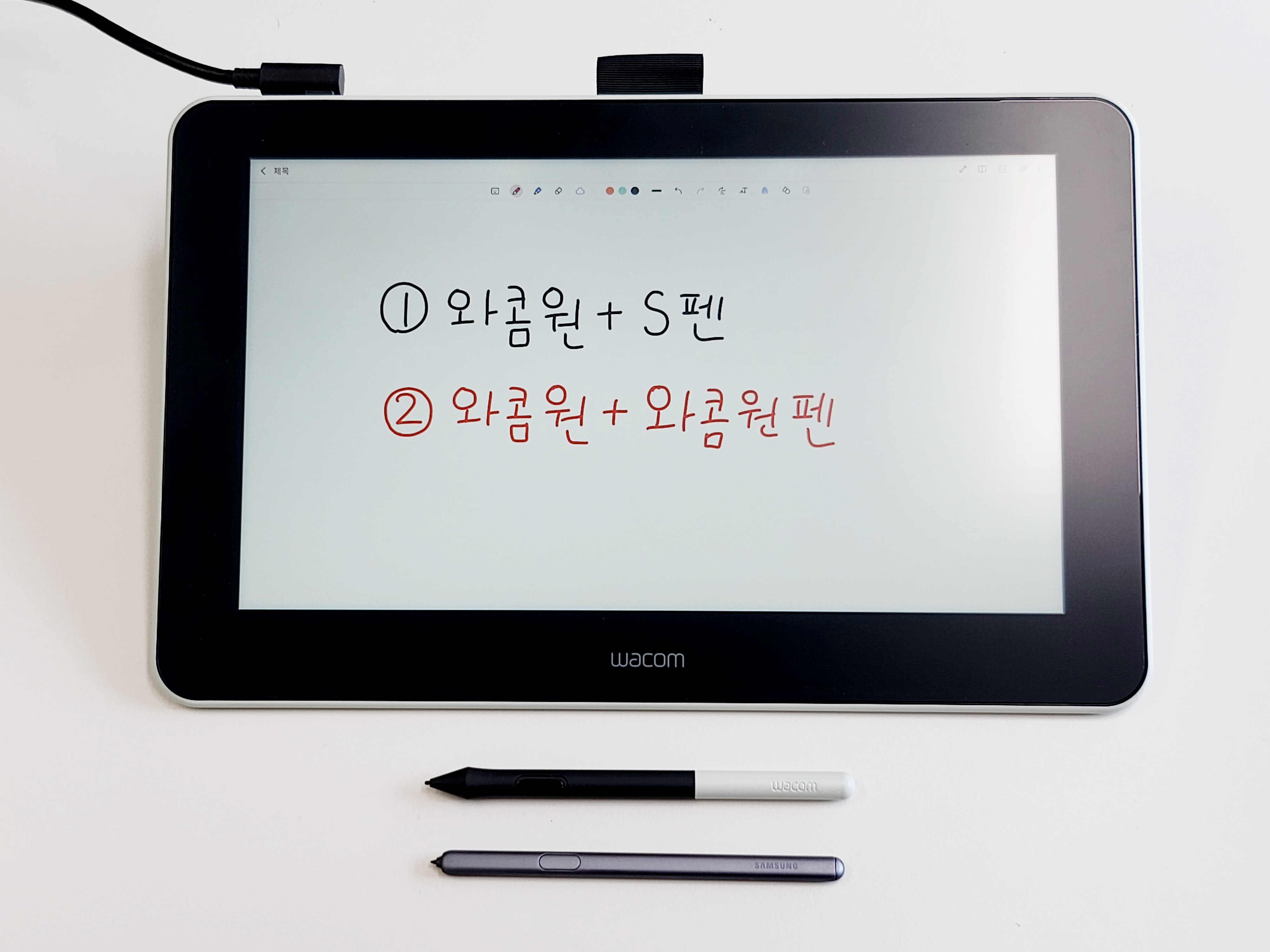 연결이 완료되었으니 와콤 원에서 삼성의 메모앱인 삼성 노트를 사용해 보겠습니다. 위 사진을 보시면 삼성 S펜을 와콤 원에 사용하고 있는 것을 볼 수 있는데요, 삼성 S펜에도 와콤의 EMR 기술이 적용되어 있기에 와콤 원 액정에도 삼성 S펜을 사용할 수 있습니다. 삼성 S펜은 와콤 원 호환 펜 목록에도 들어 있습니다.