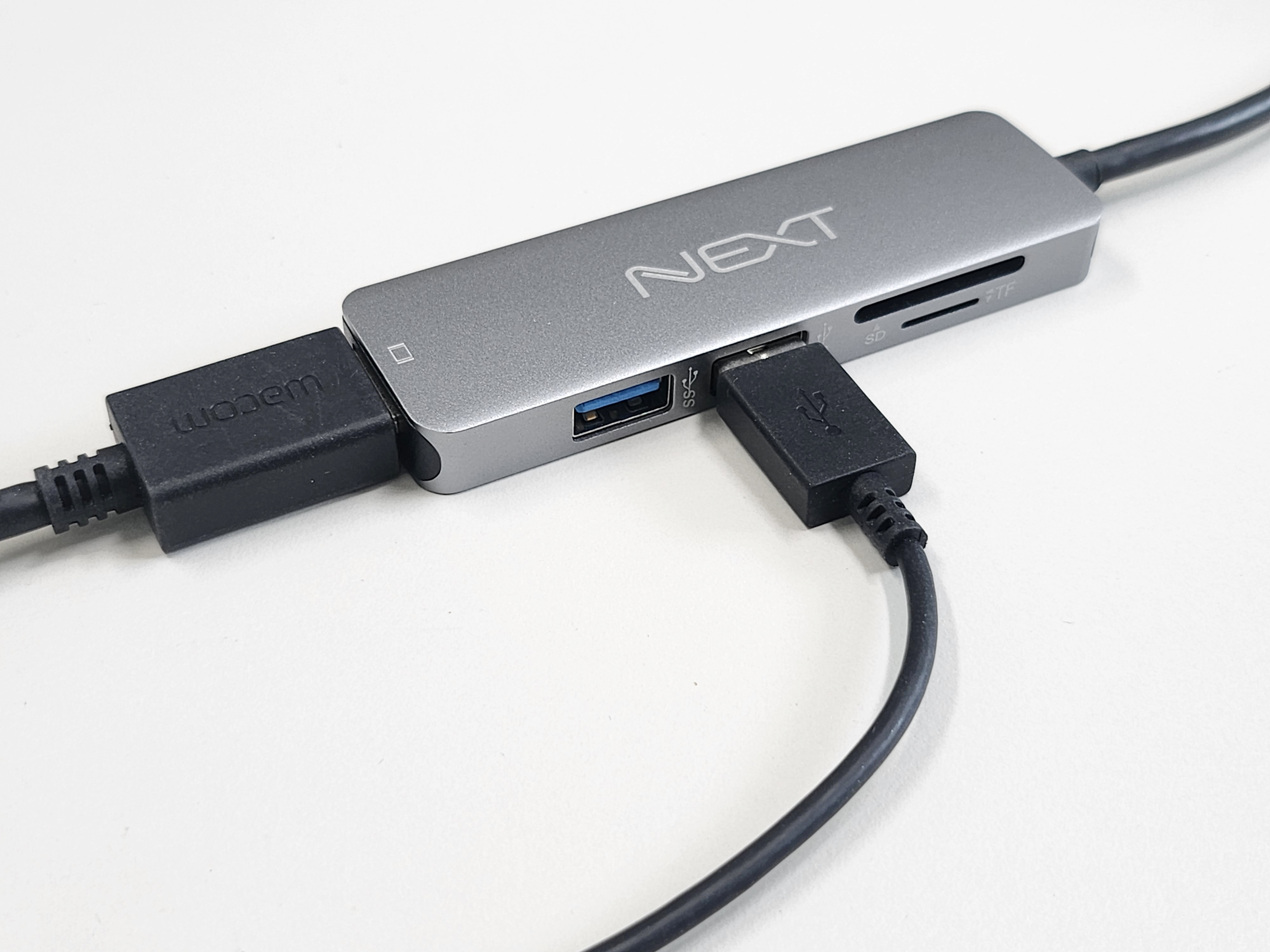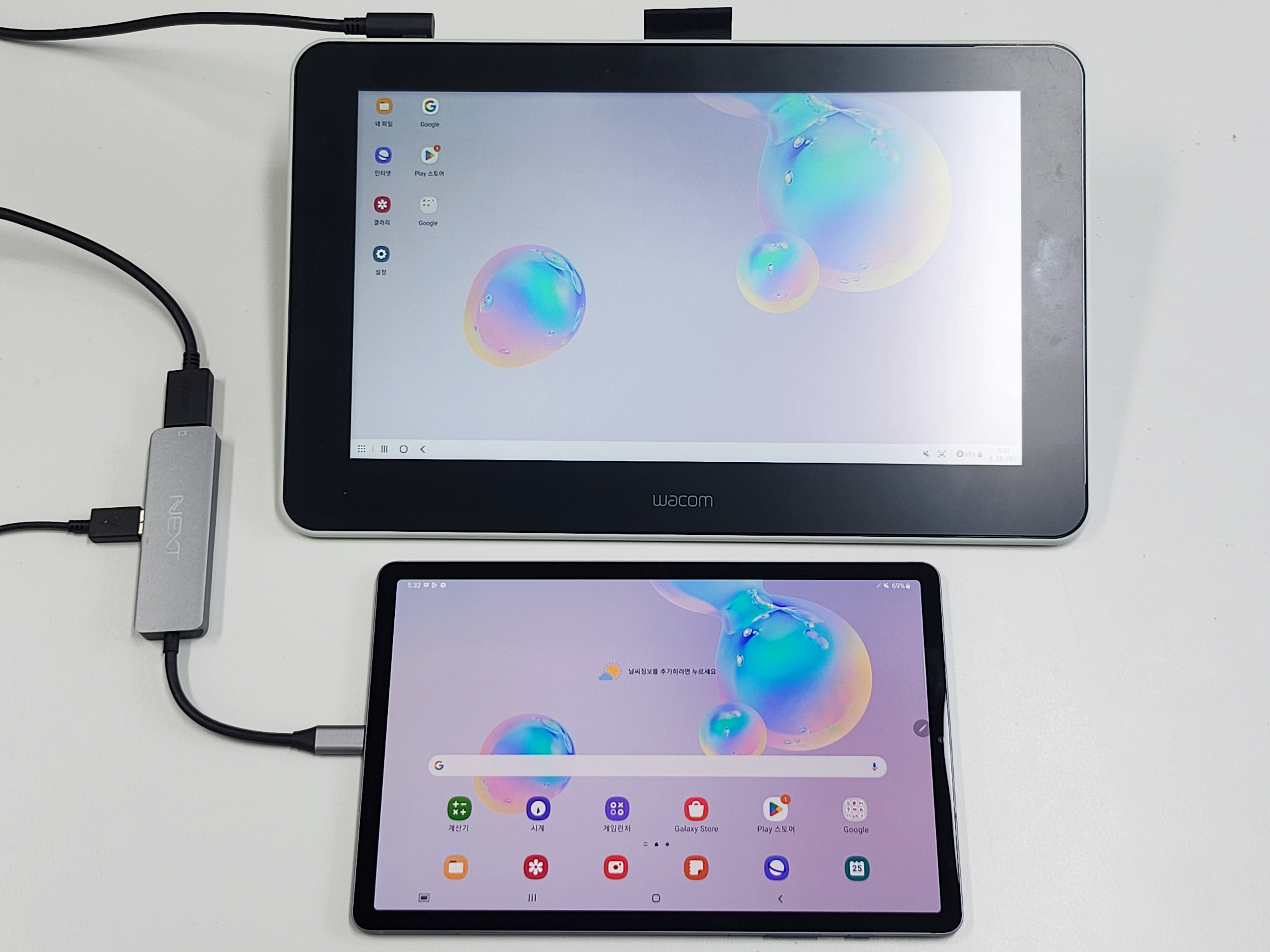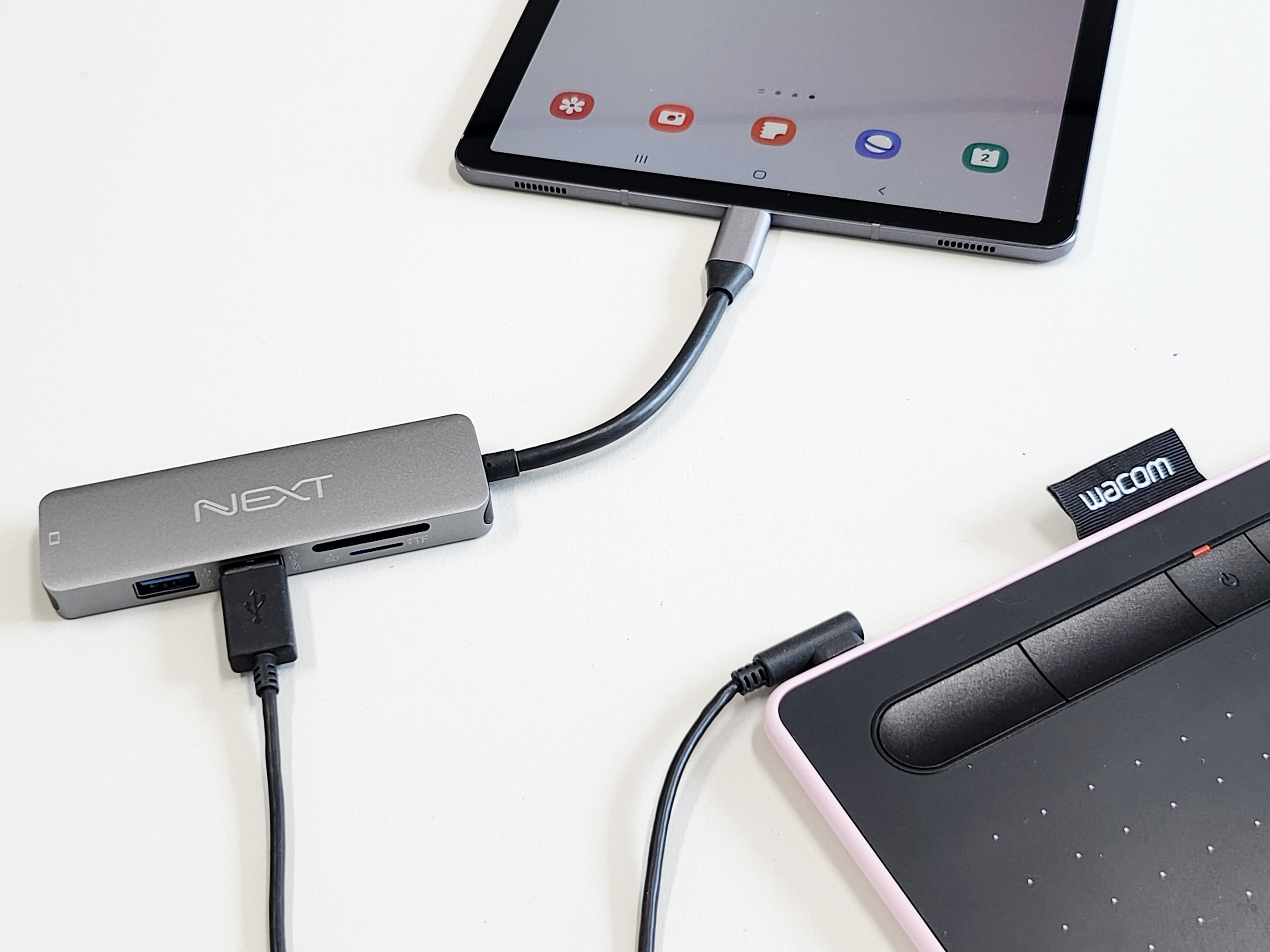 필수 준비물은 갤럭시탭과 와콤 타블렛, 그리고 USB-C 타입 허브입니다. 노트북이나 PC는 여러 개의 포트를 제공하지만, 갤럭시탭에는 C타입 포트 한 개만 있기 때문에 반드시 허브를 통해 두 기기를 연결해줘야 합니다.