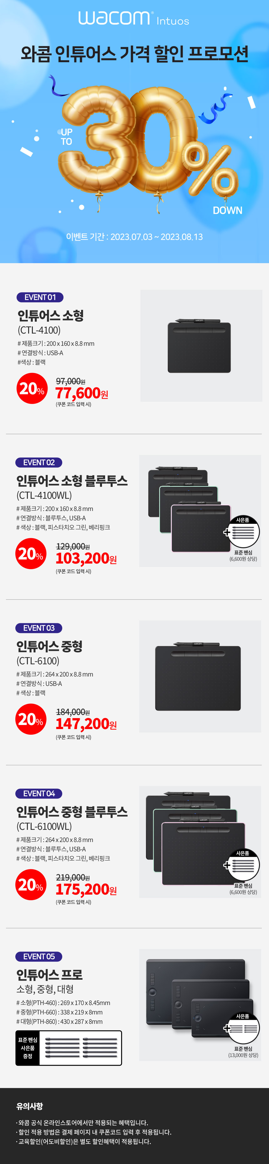 이번 프로모션은 7월 3일(월)부터 8월 13일(일)까지 한 달이 넘는 기간 동안 진행되며, 행사 매장은 행사 배너가 적용된 전국 와콤스토어를 비롯한 온/오프라인 매장입니다. 프로모션 대상 제품은 △인튜어스 소형, △인튜어스 소형 블루투스, △인튜어스 중형, △인튜어스 중형 블루투스 총 4종으로, 최대 30% 할인된 금액으로 인튜어스를 구매할 수 있습니다.