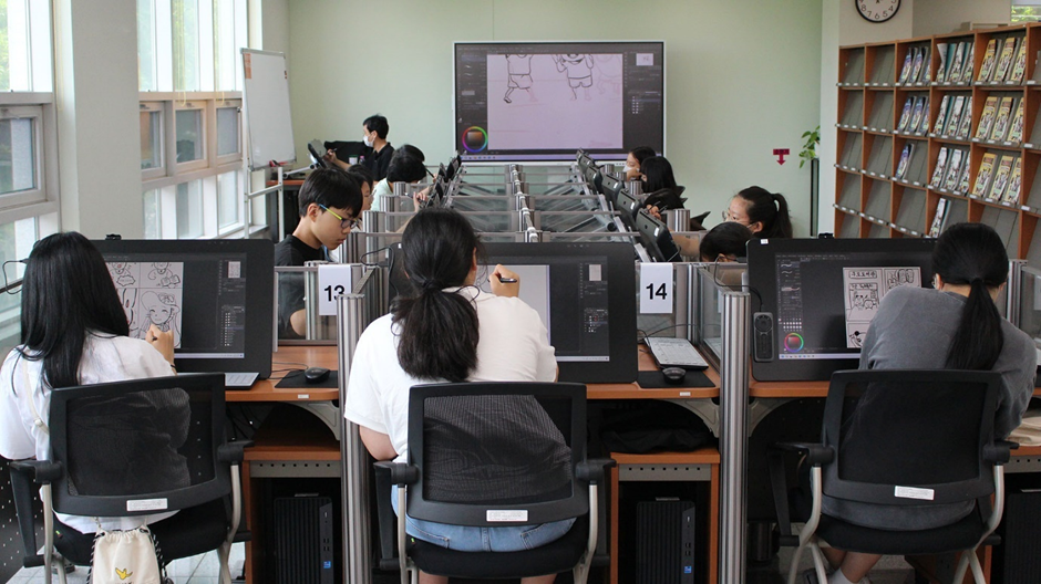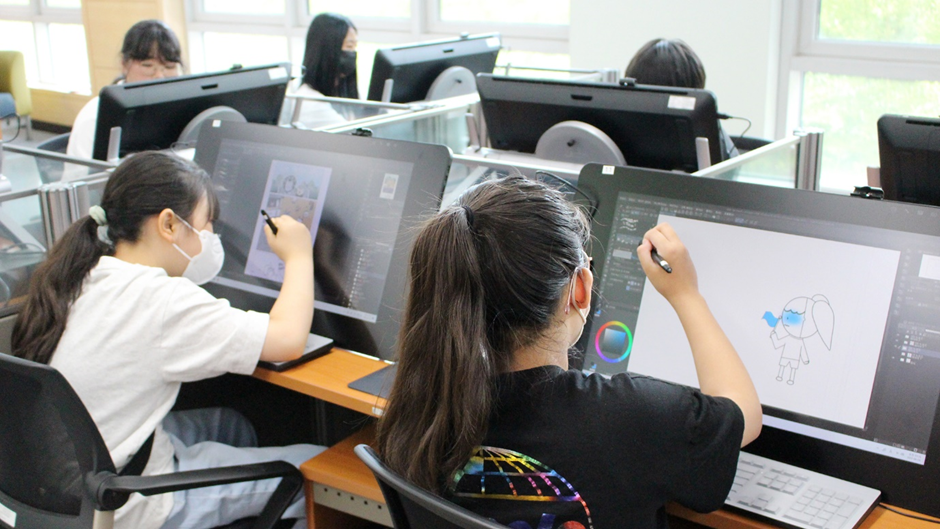 체험 공간에는 와콤의 고성능 전문가용 액정타블렛 ‘신티크프로24’와 ‘에르고 스탠드’ 세트를 도입했다. 학생들은 현업 작가들이 사용하는 고성능 장비를 활용해서 실습을 진행하고, 창작 역량을 키워 나가고 있다. 현재 웹툰창작체험실에서 진행되는 웹툰 관련 수업은 ‘인성놀이터 웹툰교실’로, 초등학교 고학년 및 중학교 1학년이 참여하고 있다. 수업은 웹툰 연재 이력이 있는 최주호 웹툰작가가 진행하며, 학생들은 타블렛 기능을 익히고 클립스튜디오를 활용해 자신만의 캐릭터와 웹툰 작품 등을 습작한다.