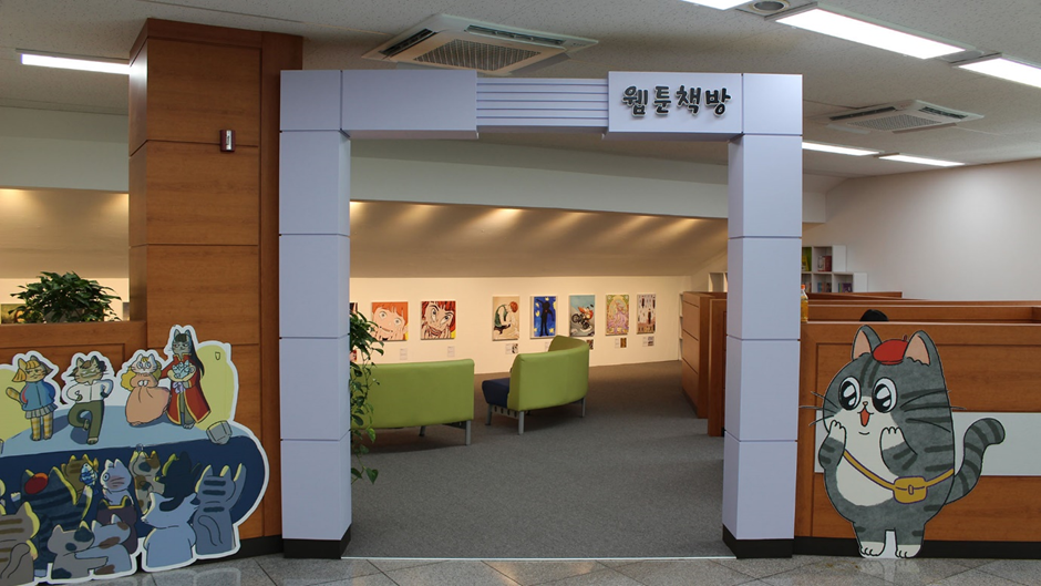 올해 문을 연 웹툰창작체험실은 웹툰책방과 체험 공간으로 구성돼 있다. 웹툰책방에서는 유명 웹툰 작품의 단행본을 마음껏 감상할 수 있으며, 학생부터 성인, 노년층까지 다양한 연령대가 이용할 정도로 인기가 높다. 한쪽 벽에는 마인드C를 비롯해 유명 웹툰 작가들이 그린 작품을 전시했다.