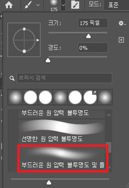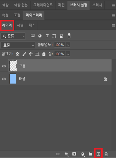 이어 구름을 그리기 전에 한 가지 해야 하는 작업이 있는데요. 바로 레이어를 추가하는 것입니다. 레이어의 의미가 ‘겹, 층’이라는 것을 생각해 보면 쉽게 이해할 수 있습니다. 층층이 그림을 쌓아 올리는 것. 다시 말해, 바탕을 칠한 후 투명한 종이를 덮어 구름을 그려 각자의 그림이 겹치지 않게 하는 것입니다. 오른쪽 중상단에 위치한 레이어 탭을 클릭하고 하단의 추가 버튼을 눌러 하나의 레이어를 추가하겠습니다. 이후, 브러쉬의 ‘부드러운 원 압력 불투명도 및 플로우’로 선택하여 몽글몽글한 구름을 그려보겠습니다.