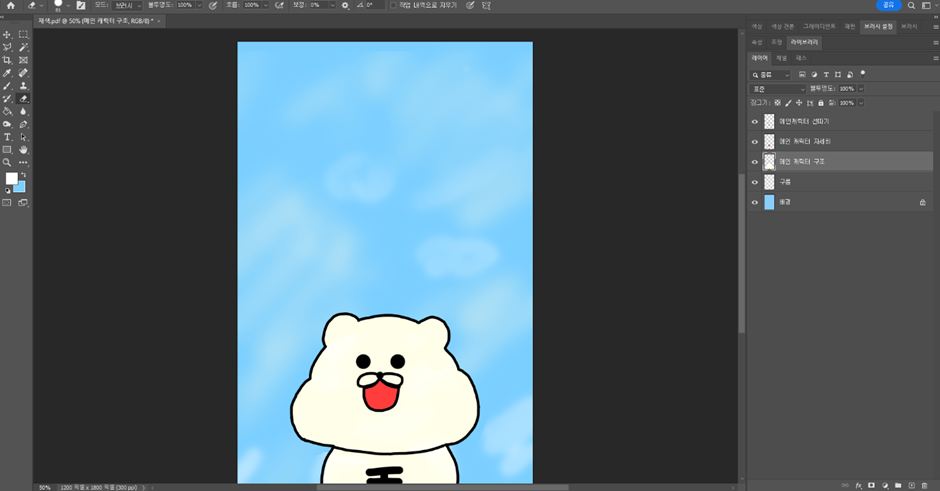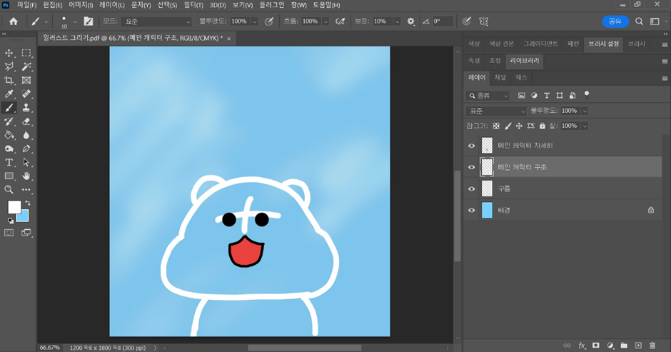 다음은 사진 가운데에 위치한 캐릭터를 그려보겠습니다. 메인 캐릭터를 그릴 때도 구름을 그릴 때와 마찬가지로 레이어를 추가하여 그리면 수정할 때 용이하니 참고해 주시기 바랍니다. 캐릭터의 구조를 그릴 레이어를 추가하여 전체적인 구조를 먼저 그려줍니다. 인물이나 동물을 그릴 때는 세세한 부분보다 먼저 전체적으로 큰 틀을 그린 후, 레이어를 하나씩 추가하며 작업하는 것이 편리하다는 팁도 같이 참고해 주세요.