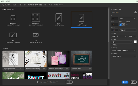 포토샵 프로그램을 열었을 때, 이전에 작업했던 항목들과 여러 카테고리들을 볼 수 있습니다. 왼쪽 상단에 있는 새 파일을 클릭하여 일러스트 작업을 시작해 보겠습니다. 새 파일을 클릭하면 그릴 캔버스의 크기를 지정할 수 있는데요. 블로그지기는 세로가 가로보다 긴 사진이기 때문에 아트 및 일러스트레이션 탭으로 들어가 엽서 캔버스로 선택했습니다. 캔버스의 크기는 이미 다양한 크기로 제작되어 있어 자신이 작업할 사이즈를 선택하거나 직접 조정도 가능하니 작업에 필요한 크기로 사용하시길 바랍니다.