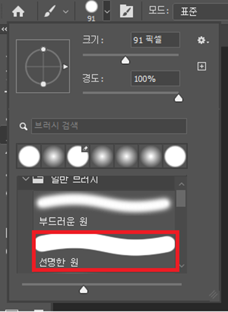 먼저 바탕색인 하늘을 만들기 위해 브러쉬 종류는 ‘선명한 원’으로 선택하여 일러스트를 그려보도록 하겠습니다. 앞서 말씀드린 ‘]’ 키로 브러쉬의 크기를 크게 하여 칠한다면 몇 번의 터치로도 바탕색을 모두 칠할 수 있습니다.