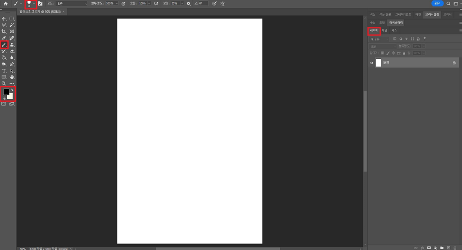 만들기를 클릭하면 상단의 이미지와 같이 흰 캔버스와 포토샵 툴이 나타납니다. 오늘 주로 사용할 툴은 왼쪽의 브러쉬와 브러쉬의 종류를 선택할 수 있는 메뉴, 브러쉬의 색을 바꿀 수 있는 메뉴, 그리고 작업 시 수정을 용이하게 해주는 레이어 메뉴입니다. 참, 브러쉬 크기는 키보드의 ‘[‘, ’]’를 눌러 순서대로 작게, 크게 조정할 수 있으니 참고하여 편리하게 사용하시면 될 것 같습니다.