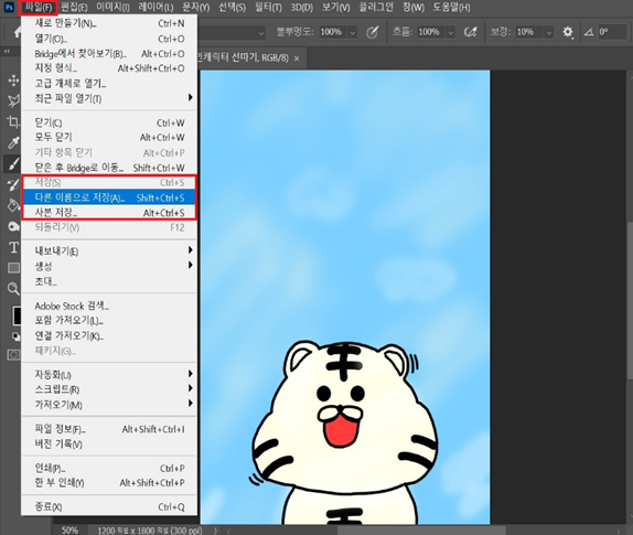 채색 후 디테일한 부분을 더하여 만든 와콤 블로그지기의 일러스트입니다. 저는 귀엽게 그려진 것 같아 꽤나 마음에 드는데요. 여러분들의 일러스트도 예쁘게 잘 그려졌는지 문득 궁금해집니다. 그럼 열심히 그린 일러스트를 파일로 저장해 보겠습니다. 저장 방법은 일반적으로 파일 저장하는 방법과 동일합니다. 파일 탭에 들어가서 저장 혹은 다른 이름으로 저장으로 간단하게 작업할 수 있으니 잊지 마시고 저장하셔서 본인만의 일러스트를 간직하시길 바랍니다.