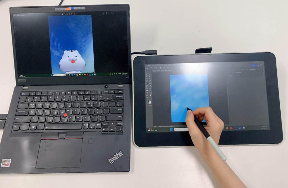 가장 먼저 직접 찍은 사진들 중 일러스트로 그려보고 싶은 사진을 골라주세요. 와콤 블로그지기는 자연과 귀여운 것들을 좋아하는지라 하늘과 캐릭터가 있는 사진을 골랐습니다. 와콤 팬 여러분들도 자신만의 특별한 추억이 있거나, 같이 지내는 가족, 친구 등 그림으로 그려보고 싶은 사진을 골라 노트북 혹은 컴퓨터 화면에 띄워 주세요. 그리고 한 쪽 타블렛에는 포토샵을 켜 일러스트를 그릴 준비를 해주시면 됩니다.