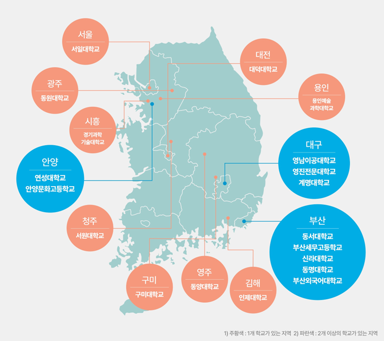 요즘 K-웹툰 성장과 함께 웹툰 작가를 비롯한 관련 직무가 주목받고 있습니다. 웹툰 작가는 물론, 인스타툰, 유튜브 애니메이션 등 만화를 소재로 한 창작자라는 직업이 학생, 청소년 모두에게 선망의 직종이 되고 있는데요. 최근 산업적, 문화적 측면에서 웹툰 콘텐츠가 각광을 받게 되면서, 전국 고등학교와 대학교에서 웹툰 전문학과를 신설하거나 개편하고 있습니다. 한층 더 발전된 형태로 웹툰 전문인력을 양성하고자 하는 건데요. 학교 교과과정을 통해서 웹툰 작가로 데뷔하는 길이 이처럼 보편화되고 있습니다. 특히 최근 생겨난 웹툰 학과 트렌드를 보면, 단순히 정적인 웹툰 작업을 넘어서 영상, 애니메이션을 접목해 배울 수 있는 교과과정으로 커리큘럼이 진화하고 있습니다. 또 창작자 양성에서 가장 중요한 부분이 바로 현업 중심의 실무교육이 아닐까 싶은데요. 최근 전국의 주요 학교에서 잇달아 와콤 타블렛을 도입하면서, 현업에서 프로들이 작업하는 환경 그 이상으로 실습 환경을 마련하고 있답니다. 그렇다면, 최근 신설된 전국의 웹툰 관련 학교는 어디가 있고, 어떤 타블렛을 사용 중일지! ‘웹툰학과 대동여지도’와 함께 와콤이 여러분께 전국의 주요 웹툰학과를 소개해 드리도록 하겠습니다!