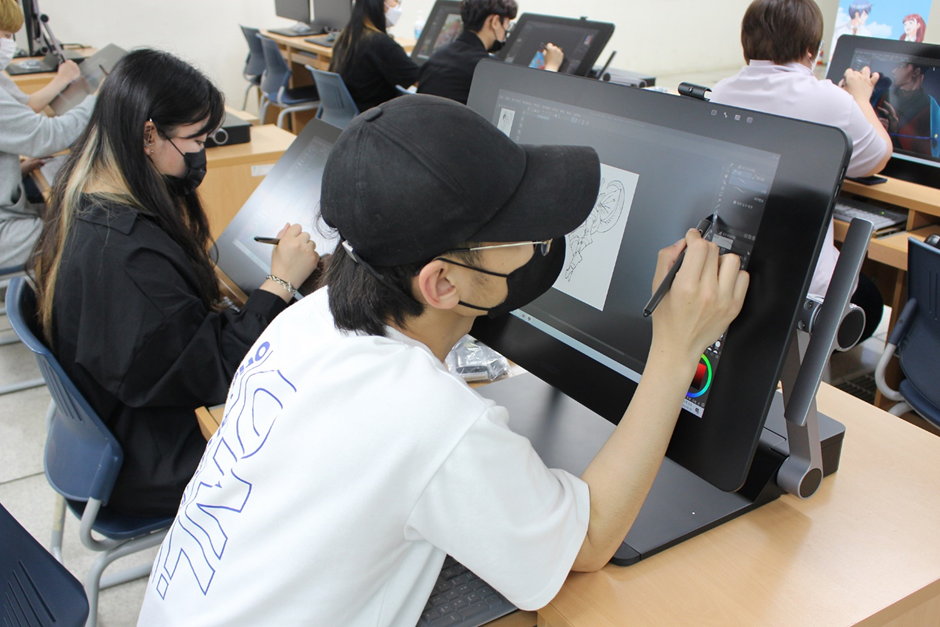 웹툰은 물론 비즈니스 수업까지 접목시켜 보다 진일보한 콘텐츠를 제작하는 창작자가 되고 싶다면, 안양문화고등학교의 웹툰메이커스과를 주목해주세요. 웹툰메이커스과는 올해 신설된 학과로 국내 최초 특성화고 웹툰학과입니다. 웹툰콘텐츠제작, 캐릭터제작 등의 웹툰 수업은 물론 산업경제, 창업일반 등의 비즈니스 수업까지 학생들이 웹툰 산업의 전문가로 성장할 수 있는 환경을 갖췄답니다. 뿐만 아니라 최고의 실습 인프라를 구축하기 위해 여러 자문을 거치며 와콤을 선택했고, ‘신티크 프로 24’ 풀 세트 25대를 도입해 학생들이 현업 창작 환경에서 학습할 수 있는 시스템을 마련했다는 점! 고등학생 때부터 전문 장비를 통해 드로잉 연습을 시작한다면 현업에서 두각을 나타내는 웹툰 전문가로 성장할 수 있을 것 같네요. 와콤 신티크프로24는 실제 웹툰 및 디자인 등 창작 업계 전문가들이 활용하는 최고 사양의 타블렛으로, 현재 부산세무고, 인천금융고 등 창작 교육 시스템을 갖춘 특성화고교에도 구축돼 있습니다.