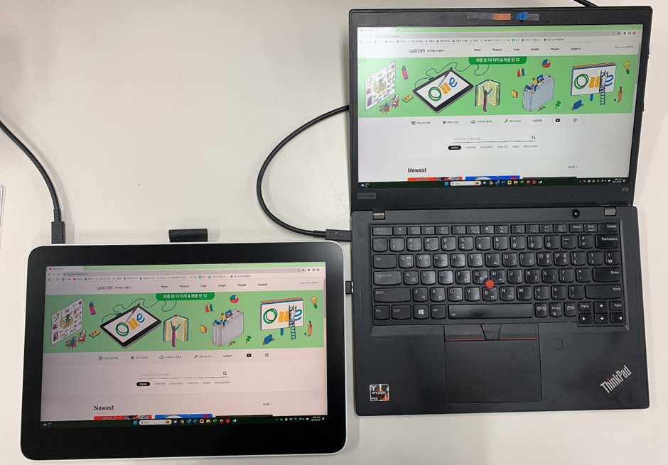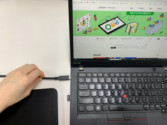 그럼, 와콤 원 13 터치와 노트북 PC 연결 완료입니다. 이렇게 USB-C 케이블 하나만으로 두 기기를 연결해 더욱 깔끔하고 심플해진 내 책상에서 와콤 타블렛을 사용해보세요!