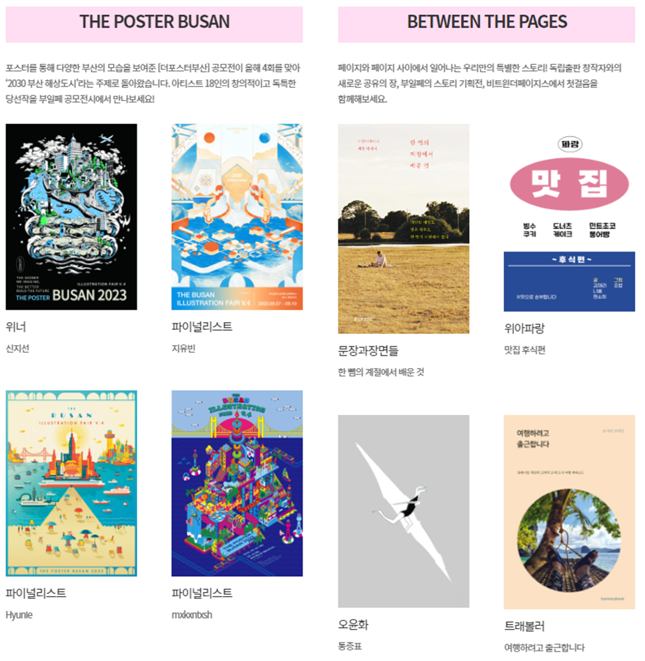 이외에도 ‘2030 부산 해상도시’라는 주제로 개최된 [더포스터부산] 공모전의 당선작 기획전, 독립출판 창작자와의 새로운 공유의 장이자 부일페의 스토리 기획전인 비트윈더페이지스 등 관람객과 아티스트 모두가 즐길 수 있는 풍성한 프로그램들이 진행됐답니다.
