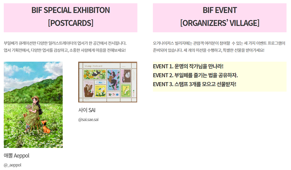 이번 부일페V.4는 그리기의 즐거움 VER.2를 주제로 진행됐습니다. 행사 내 다양한 프로그램도 준비돼 있었는데요. 하나씩 소개해 드릴게요. 가장 먼저 부일페가 큐레이션한 다양한 일러스트레이터의 엽서를 전시한 공간이 있었습니다. 자연이 주는 위안과 행복을 그리는 애뽈 작가님, 자연과 동물을 따뜻하게 그려내는 사이 작가님 등의 다양한 아티스트 분들의 엽서가 전시돼 있었답니다.
