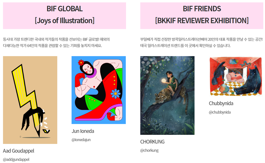 뿐만 아니라 동시대 가장 트렌디한 국내외 작가들의 작품을 선보이는 BIF 글로벌 공간도 마련돼 해외의 다재다능한 64인의 작품들을 관람할 수 있었습니다. 부일페가 직접 선정한 방콕일러스트레이션페어 20인의 대표 작품을 만날 수 있는 BIF 프렌즈 존도 구성돼 있었고요. 태국 일러스트레이션의 트렌드를 부산에서 확인할 수 있었던 흔치 않은 기회였죠!