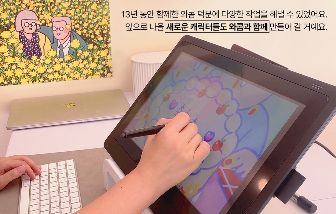 “나는 13년간 와콤을 사용했다.” 와콤을 알기 전엔 펜으로 그림을 그려서 스캔을 뜬 후 마우스로 채색하는 방식으로 작업했는데요. 우연히 한 일러스트레이터의 책을 읽다가 와콤 인튜어스를 알게 됐어요. 그때의 저는 세상에 이런 기기가 있는지 처음 알게 돼 신선한 충격을 받았던 기억이 있어요. (하하)