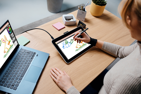 디지털 드로잉을 이제 막 시작하는 분들 혹은 디지털 드로잉을 경험해 봤지만 익숙하지 않은 초보자들은 디지털 펜을 사용해 타블렛 위에서 그림을 그리고, 이에 익숙해지는 것이 중요합니다. 디지털 펜을 활용해 타블렛 위에 그림을 그리는 것은 일반 종이에 그림을 그리는 것과 차이가 있을 수 있는데요. 따라서 포토샵, 클립 스튜디오 페인트 등의 창작 소프트웨어를 활용해 타블렛 액정 위에서 섬세한 필압을 조절해 가며 쉽게 드로잉 할 수 있도록 도와주는 와콤 원 타블렛을 초보자에게 추천하고자 합니다. 액정 위에서 직관적으로 그림을 그릴 수 있어 누구나 쉽게 타블렛에 적응할 수 있으며, 창작 소프트웨어부터 튜토리얼 영상까지 한 번에 제공하기 때문에 누구나 쉽게 창작 활동을 시작할 수 있습니다.