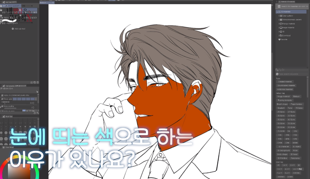 제가 생각하는 ‘S’형 캐릭터는 전체적으로 날카로운 이미지입니다. 그래서 ‘S’ 유형 답게 눈꼬리도 날렵하게 그려주었습니다. 특히 남자 캐릭터의 얼굴 측면을 그릴 때는 눈썹이 튀어나온 부분을 신경 써서 그리는 편이에요. 현재 드로잉에 사용하고 있는 기기인 신티크 프로 27을 활용하면 굵은 선과 얇은 선을 용이하게 활용할 수 있어 많은 작가님들이 좋아하실 것 같아요. 그럼 빠르게 스케치를 마무리하고 채색으로 바로 넘어가 보도록 하겠습니다.
