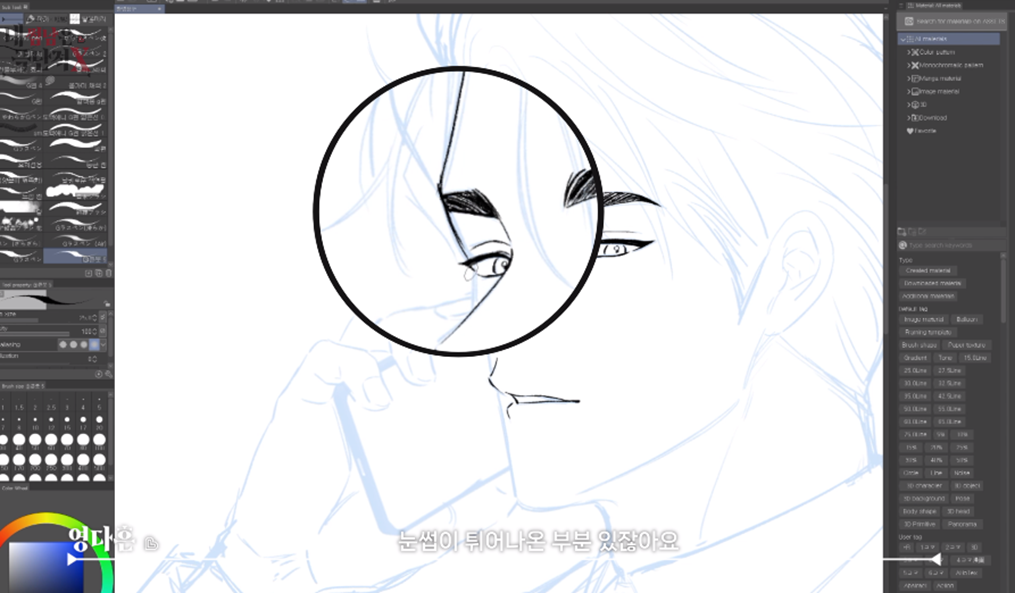 정면 이미지든 측면 이미지든 가장 중심이 되는 중요한 것이 눈이라고 생각하는데요. 그래서 저는 이목구비 작업 시에 늘 눈을 먼저 작업하는 편입니다. 그리고 바로 색을 칠하기 때문에 2차 스케치 없이 현재 하는 이 작업이 선화라고 생각하시면 될 것 같아요.