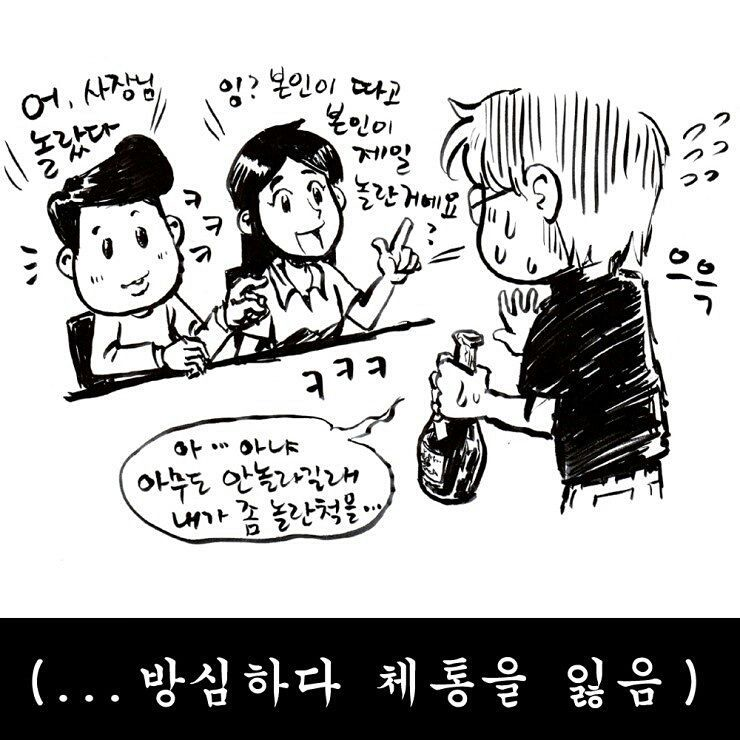 오랫동안 만화가를 꿈꾸다가 어느 날 전업 작가가 되기에는 능력도 부족하고 적성에 꼭 맞지 않는다고 생각하게 됐어요. 여러 고민 끝에 생계를 위해 자영업을 시작했는데요. 자영업을 한다고 해서 그림을 그만둘 필요는 전혀 없었습니다. 벽에 제 그림을 걸어 놓거나, 가게 메뉴판이라든가 테이블 텐트(Bar 테이블에 올려 두는 행사안내판)에 그림을 곁들여 장식할 수도 있었어요. 한가할 때는 단골손님이나 직원들의 캐리커처를 그려 보기도 했습니다. 요즘에도 종종 일상툰을 그리는데 이게 일상의 활력소가 되기도 하더라고요!