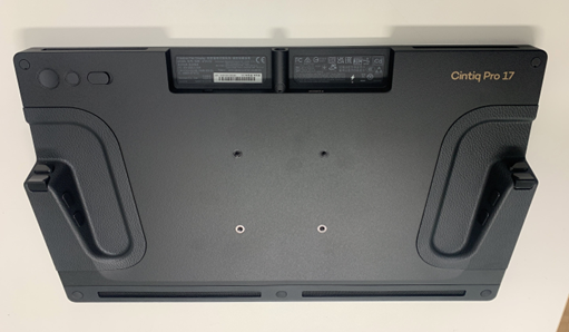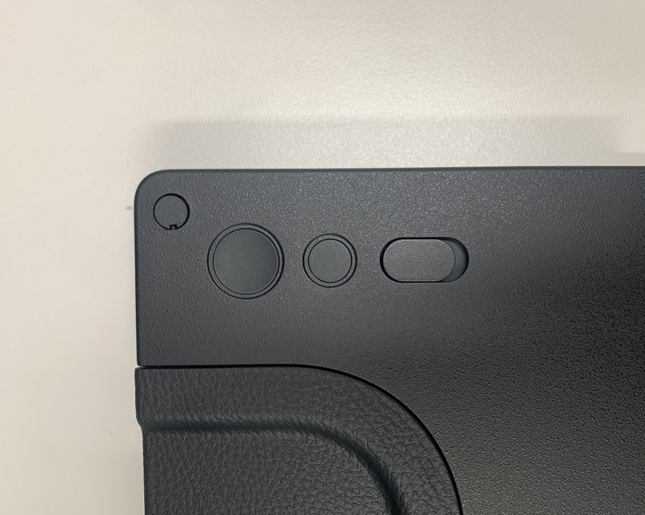 와콤 신티크 프로 17 뒷면 상단의 중앙 부분에는 PC와 연결해 사용할 수 있도록 지원하는 다양한 케이블 연결 포트가 탑재돼 있습니다. 가장 좌측부터 Mini DP, USB-C(DP Alt 모드 지원), HDMI, 전원 포트입니다.