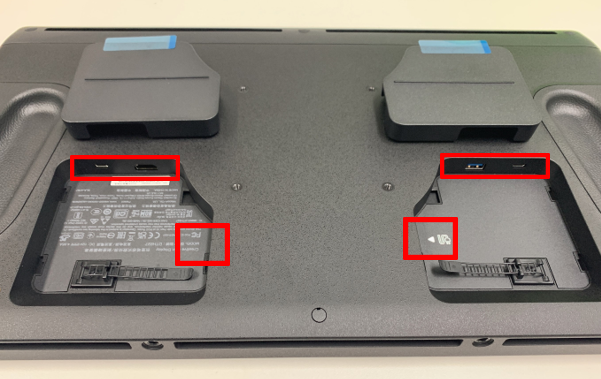 와콤 신티크 프로 22의 경우에는 날개 모양의 양쪽 판 아래에 위치해 있습니다. 두 개의 판을 열면 총 6개의 포트를 보실 수 있는데요. 가장 좌측부터 USB-C, HDMI, Mini DP, 전원 포트, USB-A, USB-C(DP Alt 모드 지원)입니다.