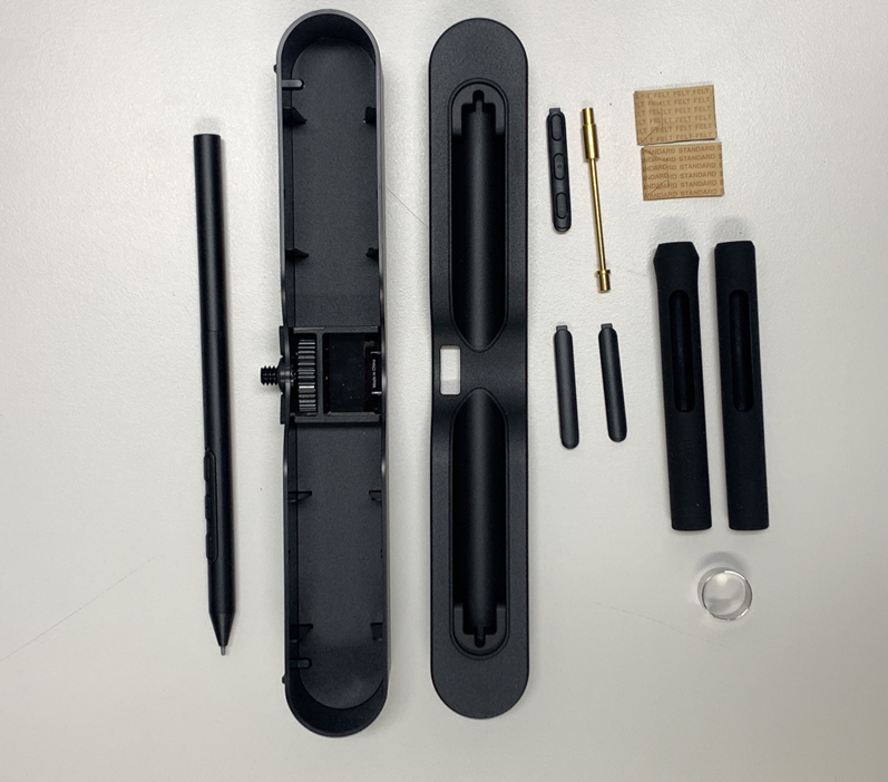 뿐만 아니라 와콤 프로 펜 3을 더욱 편리하게 사용할 수 있도록 하는 여러 부품들이 함께 들어있는데요. 와콤 신티크 프로 17과 신티크 프로 22 타블렛에 장착해 사용하는 펜 거치대부터 플레어형 고무 그립, 일자형 고무 그립, 그립 장착 여부에 따른 사이드 버튼 플레이트(3가지), 무게추, 교체용 표준 펜심(5개입), 교체용 펠트 펜심(5개입), 펜심 교체 도구까지 필수 구성품을 제공해 많은 크리에이터들의 보다 편안한 작업 환경을 지원하고 있습니다.