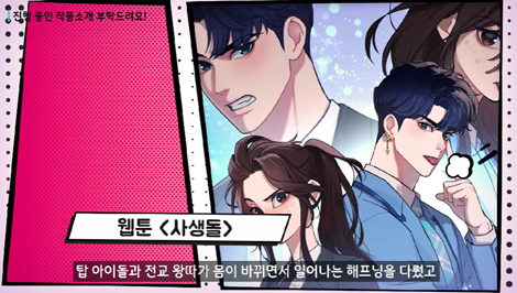 연재 중인 세 작품을 하나씩 소개해 드릴게요. 가장 먼저 로맨틱 코미디 장르의 웹툰 ‘존잘주의’는 외모로 고통받던 주인공이 매력적인 악마 존을 만나면서 스탯을 이용해 외모를 올릴 수 있는 능력이 주어지며 일어나는 스토리의 작품입니다. 다음으로 ‘사생돌’은 서로 정반대의 인생을 살던 탑 아이돌과 전교 왕따가 몸이 바뀌며 일어나는 해프닝을 다룬 작품입니다. 마지막으로 ‘신 장산범’은 고된 하루하루를 살던 여주인공이 능력치 만렙 요괴 장산범을 만나면서 인생이 뒤바뀌는 로맨스릴러입니다.