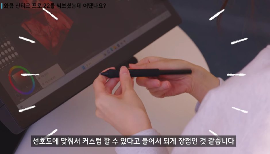 와콤과의 인연은 꽤 오래된 편이에요. 아무래도 와콤이 타블렛으로는 가장 대중적이고 친숙한 편이다 보니 저도 웹툰 작가 지망생일 때부터 사용해 왔거든요. 원래 작업용으로 와콤 신티크 프로 24 모델을 사용하고 있는데요. 그래서 그런지 처음 신티크 프로 22를 받았을 때 좀 작다는 생각이 들었어요. 근데 이번 모델은 기존 제품과 달리 베젤은 더 얇아지고 스탠드도 작아져서 작업 공간을 덜 차지하더라고요. 또 설치 시간도 굉장히 적게 걸려 사용하기 편리하다고 느꼈습니다.
